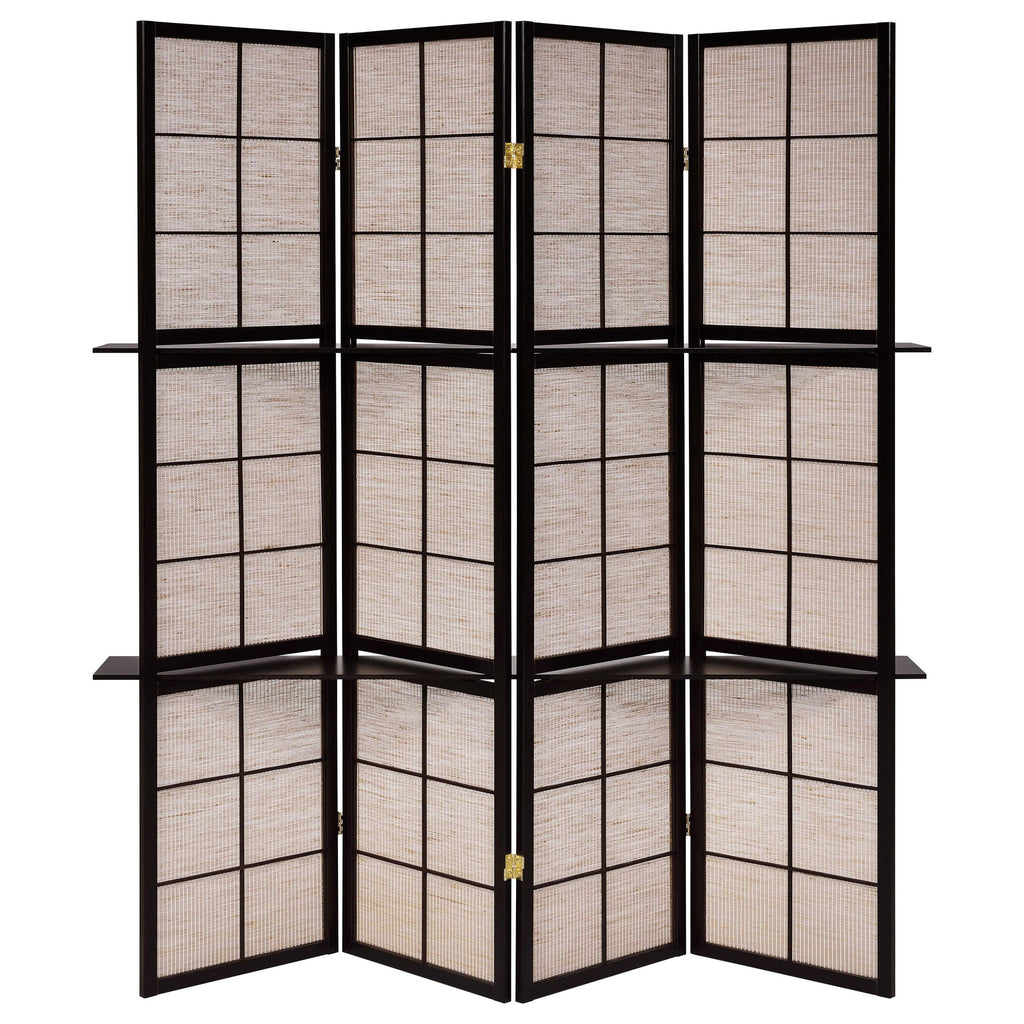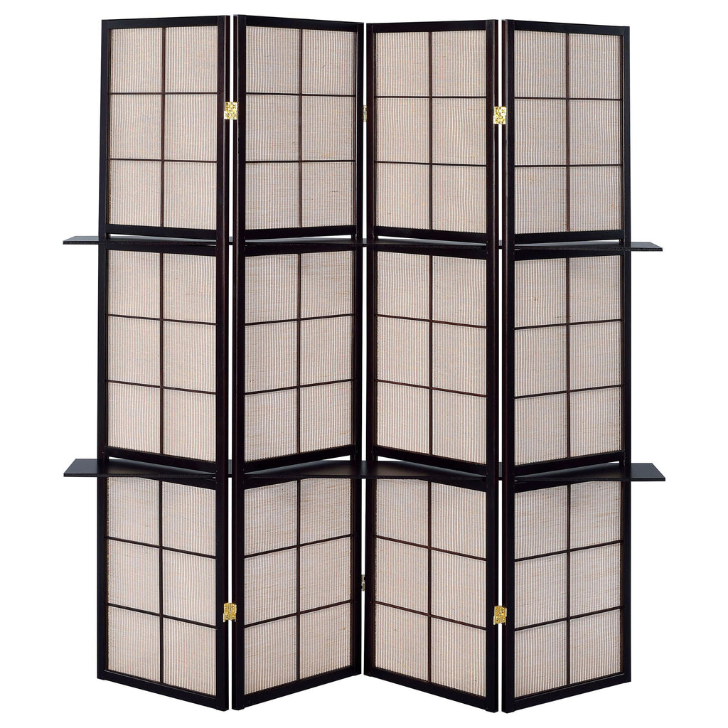 A hint of nature's earth ambiance makes its way into a decor classic. Ideal for a large space, this four-panel screen adds a functional bonus as well as a delightful artistic plus. Four panels join with hinges to accommodate varying configurations. They offer space for storage with diminutive shelving. A deep cappuccino finish embellishes the natural ambiance of tan screen panels.