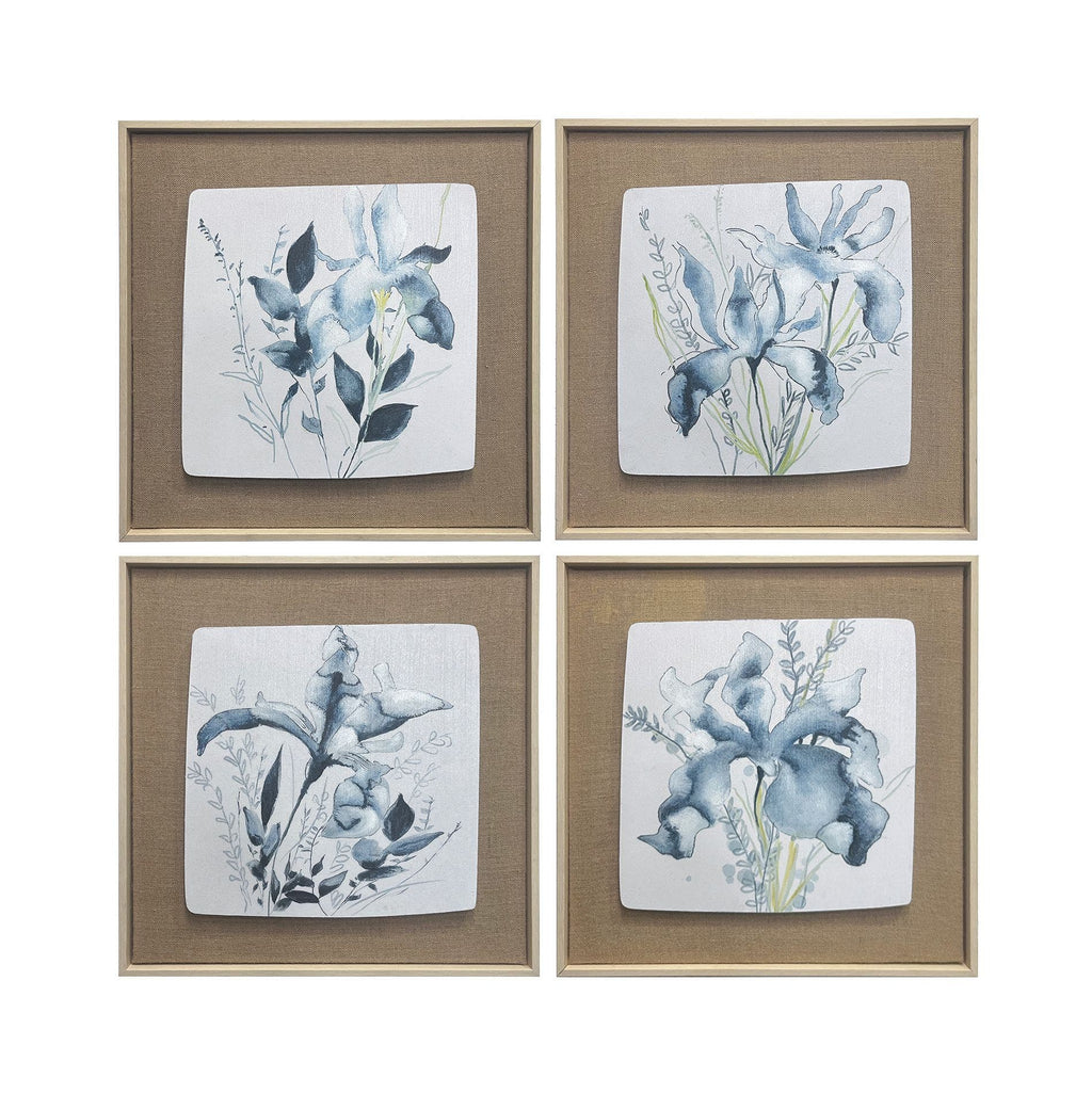 Celebrate the raw beauty of nature and the expressive power of watercolor with the Indigo Blooms wall art set by Crestview Collection. Each piece in this curated set features a distinct wildflower, rendered in a vibrant burst of deep indigo blue watercolor across the white sheet canvas. Adding richness and tactile contrast to the composition is a panel of brown linen material that serves as the backdrop for each canvas. The earthy tone of the linen softens the starkness of the white canvas and enhances the vibrancy of the indigo blue. Framing each piece is a natural wood frame in a light brown stain, offering a final layer of warmth and subtle sophistication. Whether displayed as a cohesive group in a hallway, above a sofa, or in a dining area, or separated and thoughtfully placed throughout your home, the Indigo Blooms wall art set offers countless styling possibilities.