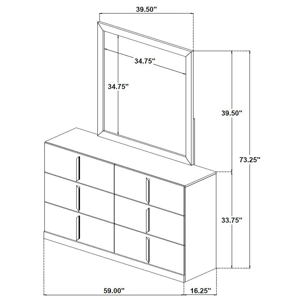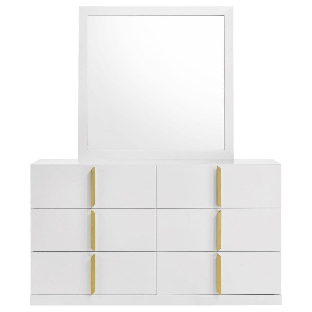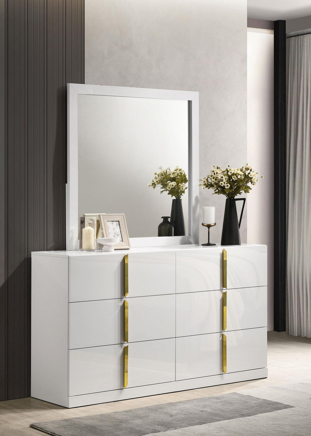 Sleek and symmetrical, this six-drawer dresser with mirror offers bold style inspired by Italian contemporary design. The white high gloss finish is crafted from eco-friendly PET thermoplastic, offering exceptional scratch resistance, moisture protection, and long-term durability. Vertically mounted polished gold pulls create striking contrast, while the framed mirror completes the look with clean lines and reflective clarity.