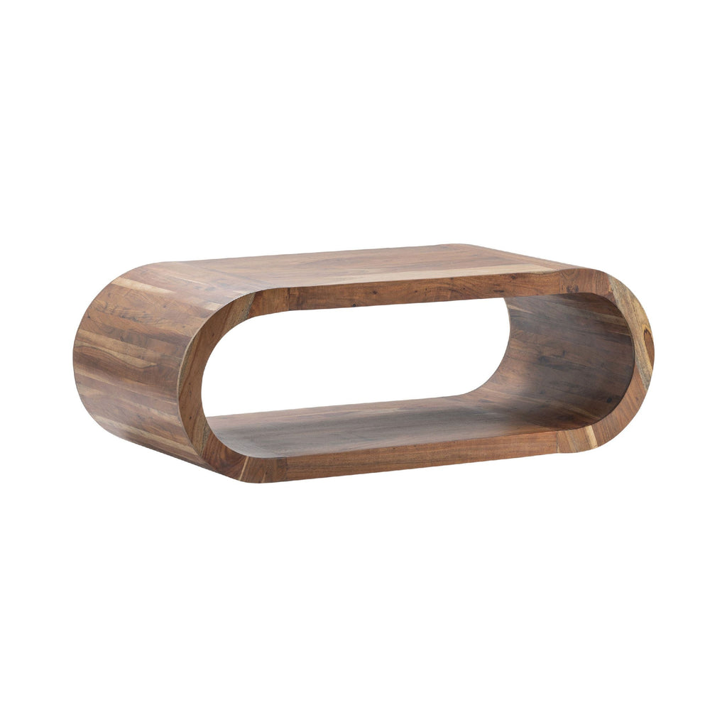 The Crestview Collection Infinity Cocktail Table has a simplistic, modern design that will bring a refreshing, new feel to your home. The table has a long, rounded design that gives a soft look. The design gives an open shelf at the bottom for display or storage. This piece is made of wood and features a medium-brown finish.