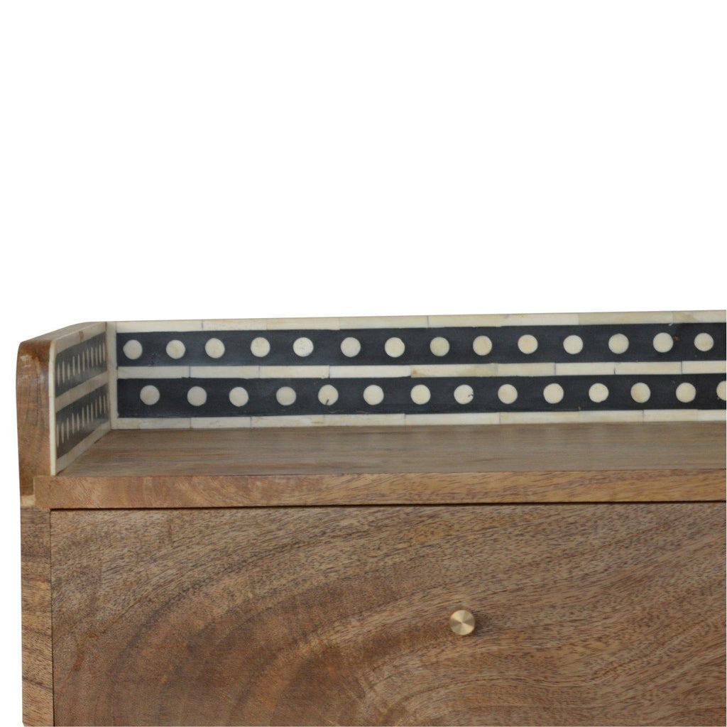 - Bone Inlay Gallery Back Bedside - Small tables or dressers that can store bedtime necessities such as night-lights, flashlights and books.