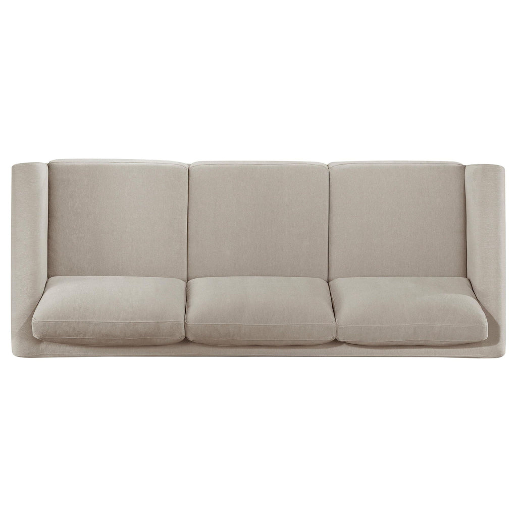 Rooted in clean architectural lines, this upholstered sofa set blends modern structure with plush comfort. Each piece is framed in engineered wood with a warm coffee finish and features recessed panel arms that lend sculptural definition. Upholstered in soft taupe polyester, the seat and back cushions are fully reversible, offering extended usability and lasting support. Designed to bring balanced form and function to contemporary living spaces.