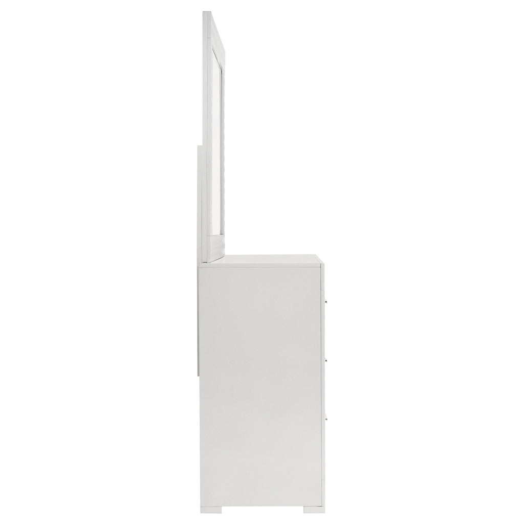 Bring a touch of modern luxury to your bedroom with this dresser and mirror set. Featuring a high gloss finish and 3-dimensional diamond tile emboss, this set exudes contemporary Italian style. The dresser offers ample storage with six spacious drawers, including felt-lined top drawers for delicate items. The matching mirror adds a cohesive element, enhancing the set's sophisticated design. This dresser and mirror set is perfect for those who appreciate refined aesthetics and quality craftsmanship.