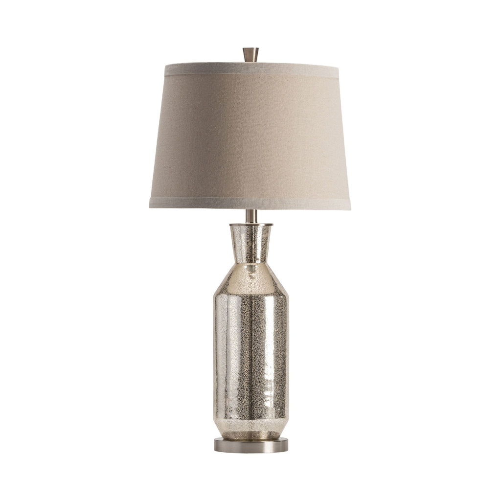 The Crestview Collection Jaden Table Lamp I has a warm bronze finish that will glisten under the light of the lamp. Sitting atop a round base, the glass, bottle-shaped body points toward a tapered shade. This transitional lamp will bring a cozy feel to your home.