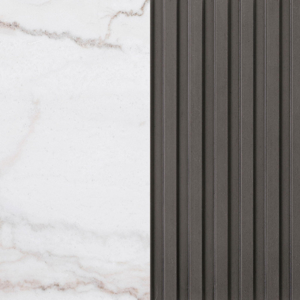 This round end table is the perfect complement to any living room setup. Its genuine white marble top, with delicate veining, brings an element of sophistication to your space. The engineered wood frame in a charcoal finish features ribbed detailing that adds texture and depth, while the brushed gold metal base ensures a luxurious foundation. This versatile side table seamlessly combines modern materials and a stylish design to elevate your home.
