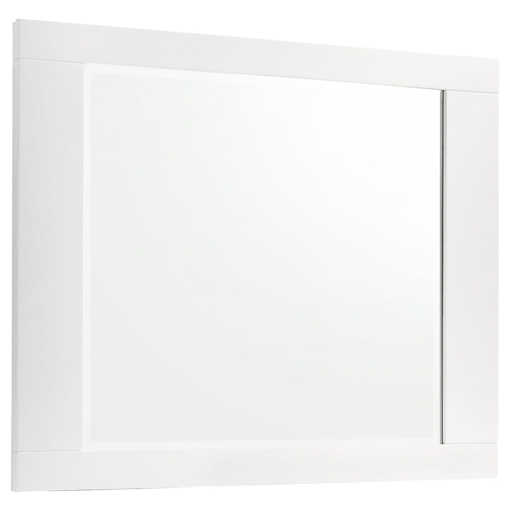 Bold and modern, this five-piece bedroom set is ideal for a contemporary home. It comes complete with a bed, nightstand, chest, dresser, and mirror to effortlessly complete your space. Each piece is coated in white polyurethane with a beautiful, high-gloss finish. Shining chrome accents add a dazzling hint of polish. With a sleek design and quality craftsmanship, this set is a stylish choice.
