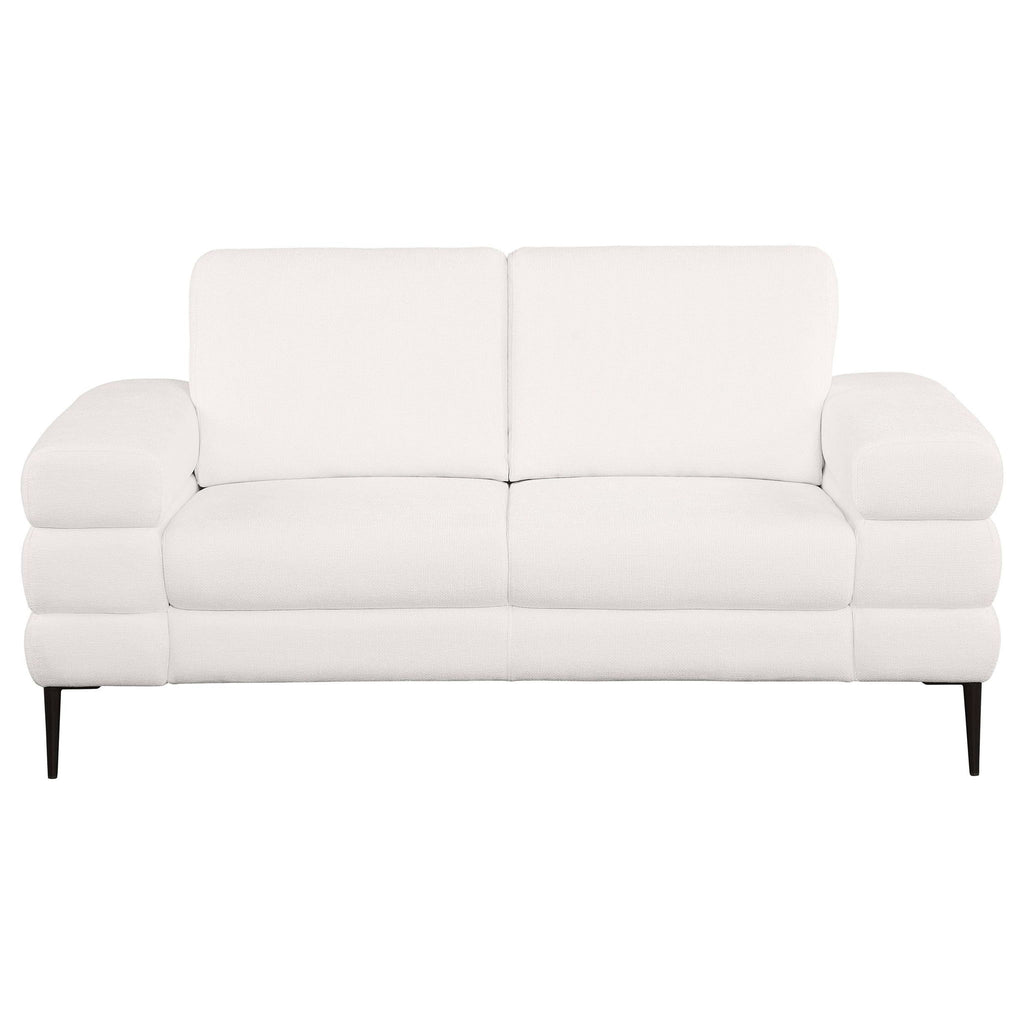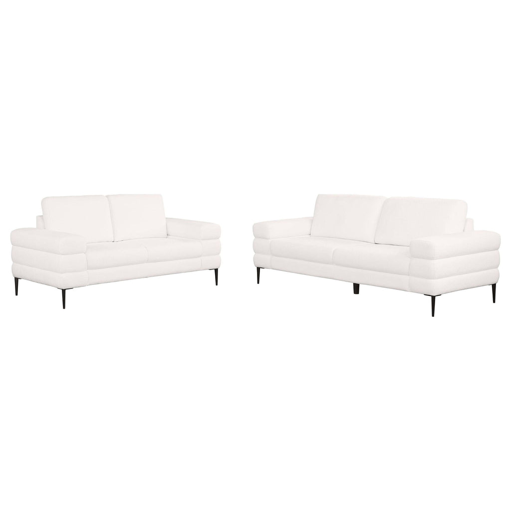 Transform your living room with the modern sophistication of this sofa and loveseat set. Both pieces feature tube-like geometric sculptured track arms, offering a unique and stylish design that sets this set apart. Wrapped in beautiful ivory chenille basket weave fabric, the set exudes elegance and provides an inviting seating experience. Supportive reversible back cushions ensure comfort and can be easily flipped for even wear and extended use. Thin metal legs add to the modern appeal, creating a light and airy look while providing a sturdy foundation.