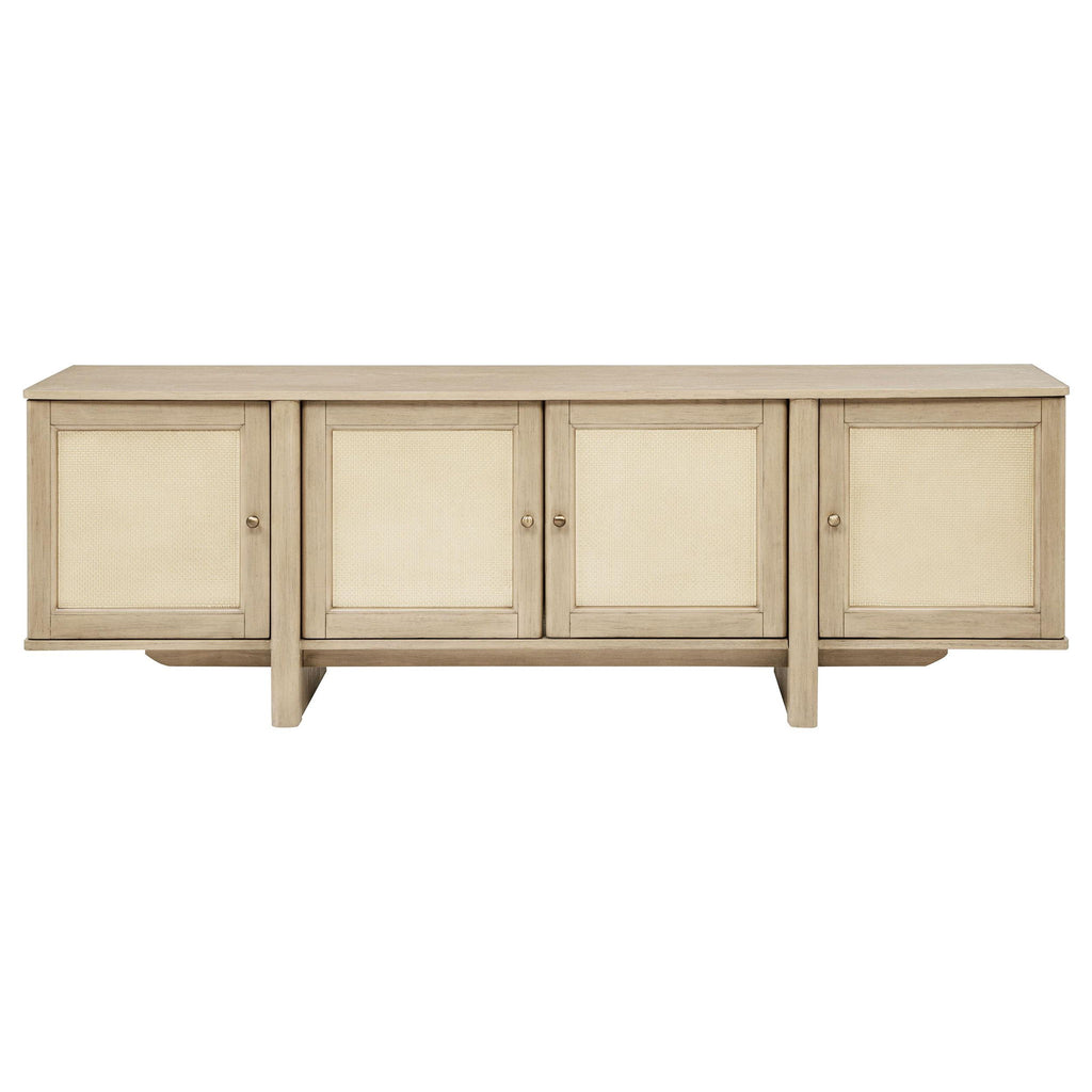 This 79-inch TV stand captures California coastal modern living with a balance of authenticity and ease. Inspired by 1970s silhouettes, its streamlined rectangular case is fitted with four framed doors featuring woven cane fronts, bringing natural texture and depth. Crafted from solid poplar, engineered wood, and oak veneer, it ensures durability with timeless appeal. Designed as a media console or entertainment center, it accommodates up to an 85-inch TV while offering concealed storage for electronics and essentials.