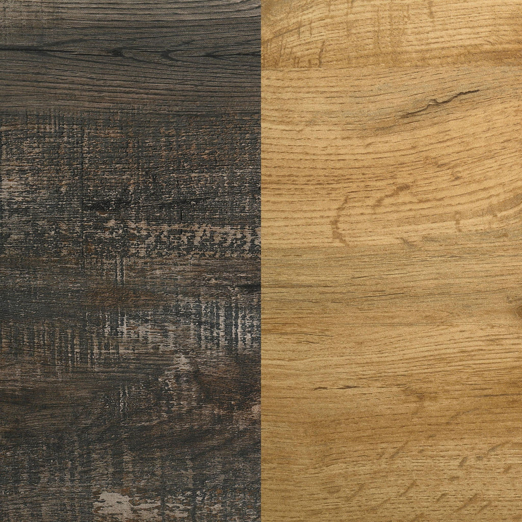 Transform your bedroom into a stylish retreat with this bedroom set. Combining mid-century modern design with a rustic wood grain effect, this set creates a warm and sophisticated ambiance. The weathered brown and natural pine finish, accented by matte black metal pull handles, adds warmth and sophistication to your space. Crafted from durable engineered 3D paper veneer, each piece offers both style and functionality, ensuring a cohesive and elegant look for your bedroom.