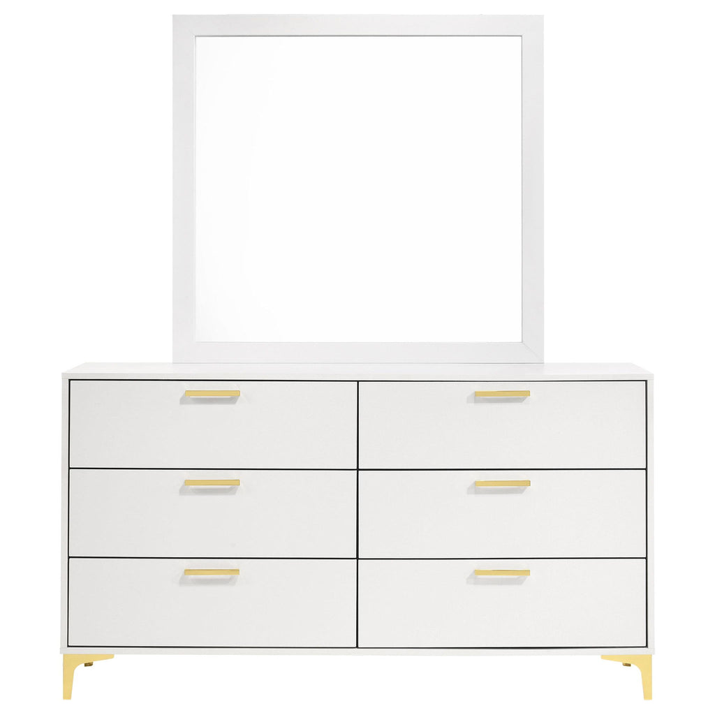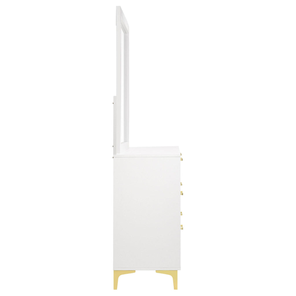 Brighten up your bedroom with the modern glam and cheer of this six-drawer dresser, a statement piece that brings a light and airy feel to contemporary spaces. Gold-finished pulls and bracket-style legs infuse the piece with a touch of luxury, while the crisp white finish keeps it sleek and dignified. Ideal for anchoring your focal wall or complementing a vanity area, this long and narrow dresser is a splendid addition. The accompanying contemporary mirror, framed in white, adds height and elegance, creating a formal vanity when placed atop the dresser.