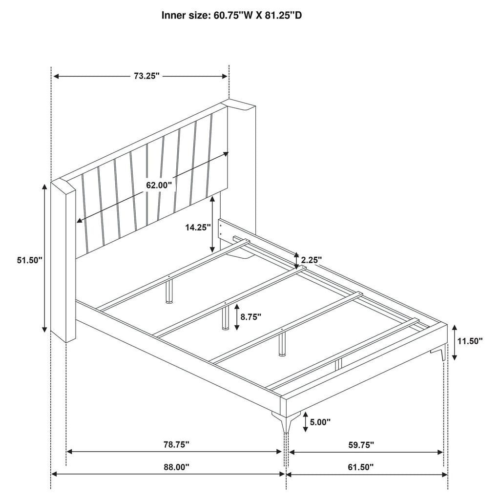 Steeped in glamour, this modern upholstered bed pairs a lush look with a wingback headboard silhouette that evokes timeless character. Black upholstery is soft and rich, with a tall headboard profile that creates a chic focal point for surrounding decor. Golden rays decorate the headboard, adding verticality and gleaming contrast for a chic, refined touch of elegance. Padding add impeccable comfort for lounging and reading in bed while additional support legs add stability to the center of the bed. Style the bed with gorgeous linens to complete your sophisticated bedroom.