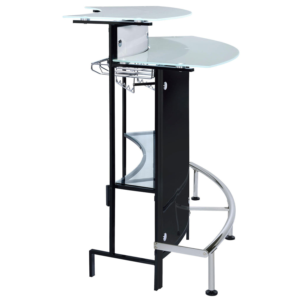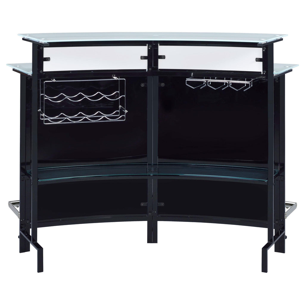 Entertain in sleek sophistication with this modern home bar, featuring a curved silhouette, chrome accents, and glossy black and white acrylic panels. Dual-tiered frosted glass tops offer ample space for mixing and serving, while the metal footrest invites guests to sit back and enjoy the experience. Designed to impress in any lounge or entertaining space.