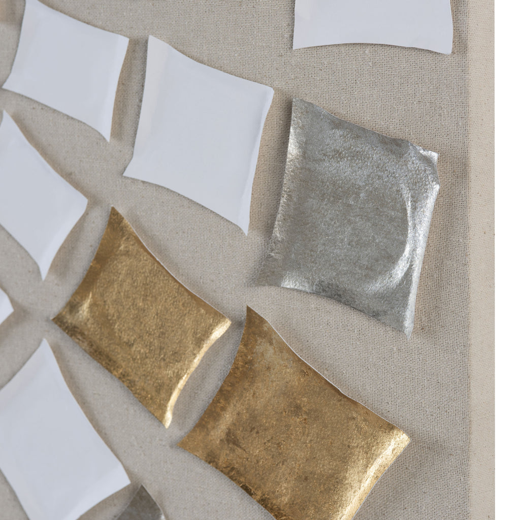 Introducing our beautiful unframed canvas, perfect for adding a touch of elegance and intrigue to any room. The Langston piece of art features a unique circle design made up of cut-out embellishments. The embellishments are scattered throughout the canvas, featuring a beautiful blend of white, silver foil, and gold foil accents. The combination of colors and textures creates a beautiful and mesmerizing visual effect that is sure to captivate any viewer. Crafted with the highest quality materials, this canvas is built to last. The cut-out embellishments are expertly placed and secured to the canvas, creating a beautiful and durable piece of art.