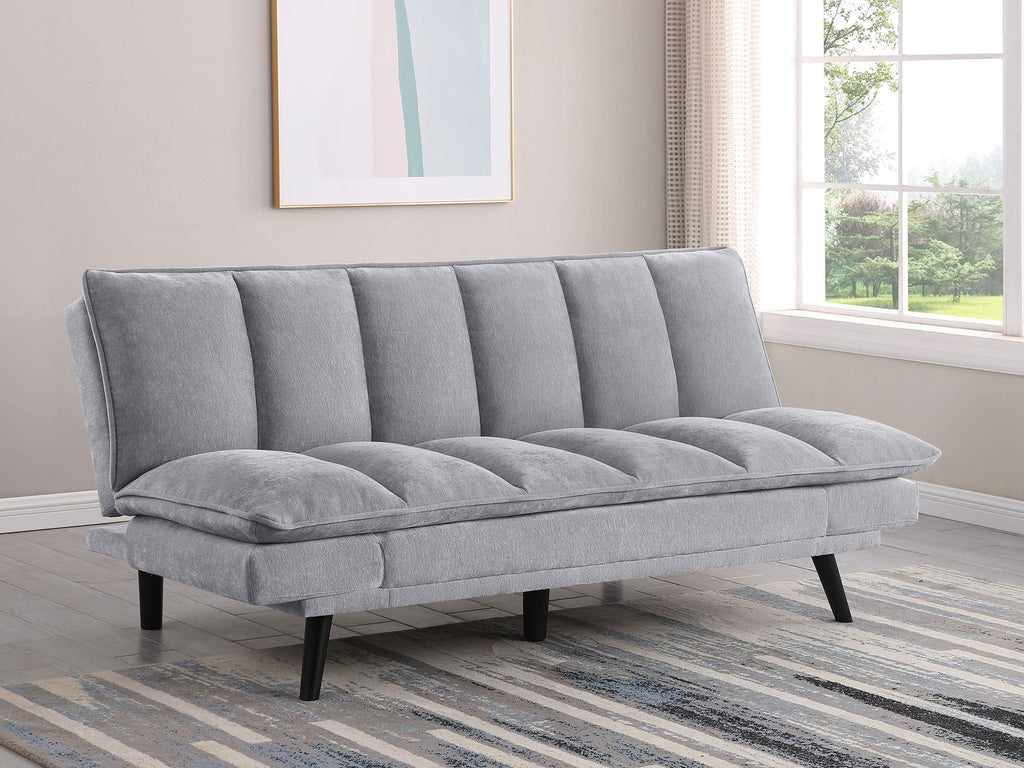 Versatility reigns in a modern sofa bed. Soft upholstery complements perfectly, bringing inviting style to a convertible design. It goes from sofa to bed with a lay-flat mechanism, perfect for a multi-functional space like a home office or compact living room. Tufting adds a sense of structure to the design. Splayed legs receive a black finish, offering a chic look against lighter upholstery.