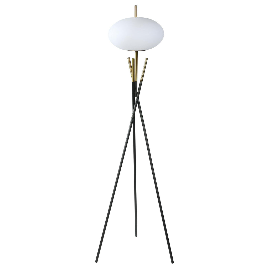 This floor lamp offers a striking modern design with its unique tripod base and frosted globe-shaped shade. Crafted with a combination of sleek black and gold metal finishes, the lamp exudes elegance and contemporary charm. The frosted plastic shade provides soft, diffused lighting, making it suitable for a variety of settings. Sturdy and functional, this lamp is an ideal addition for those seeking a blend of aesthetic appeal and reliable illumination.