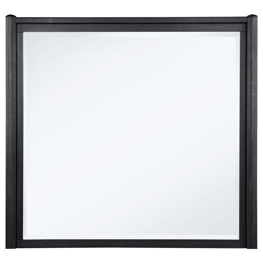 Minimal in form yet rich in presence, this dresser mirror is framed in burnished black with a subtle radius edge that complements the collection’s curved silhouette. Designed to pair perfectly with the coordinating dresser, its tall proportions create balance and open up the room with gentle reflection. Clean lines and refined simplicity complete this quiet, grounded piece.