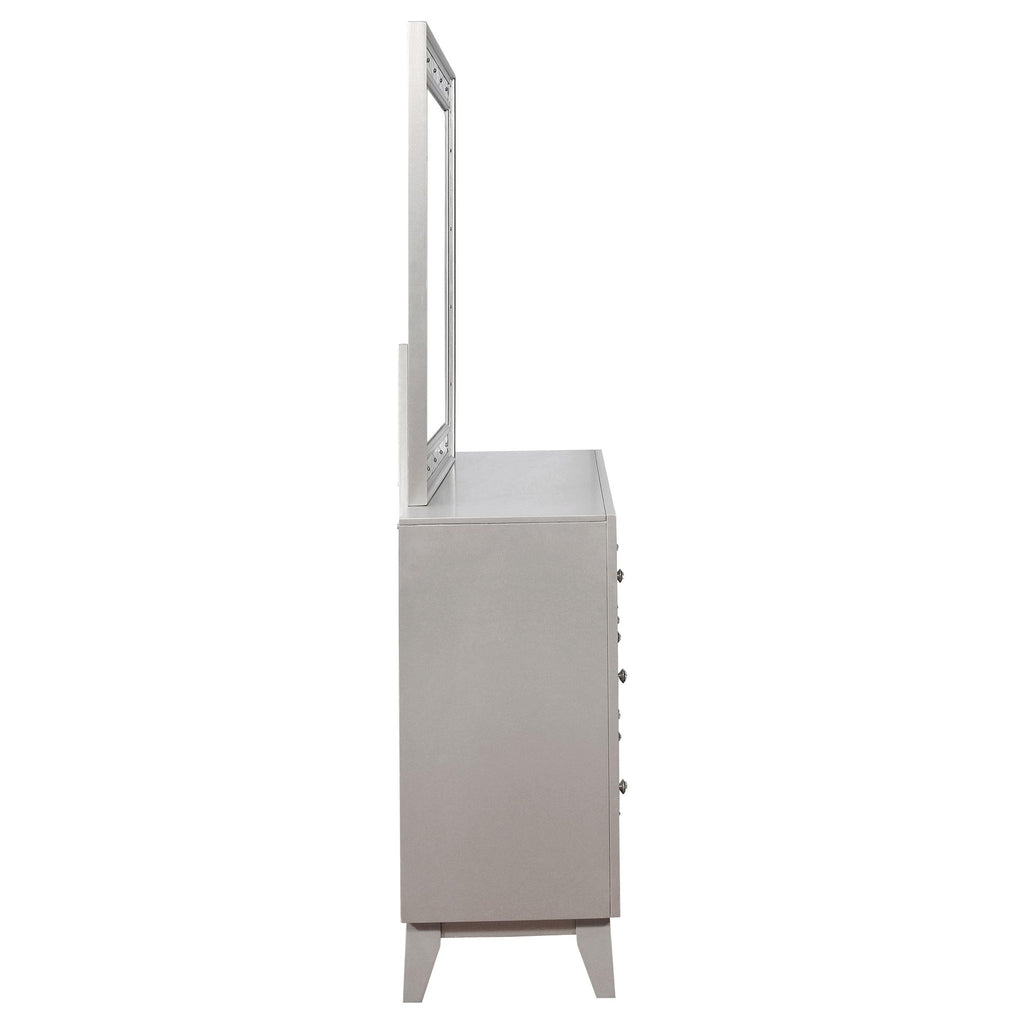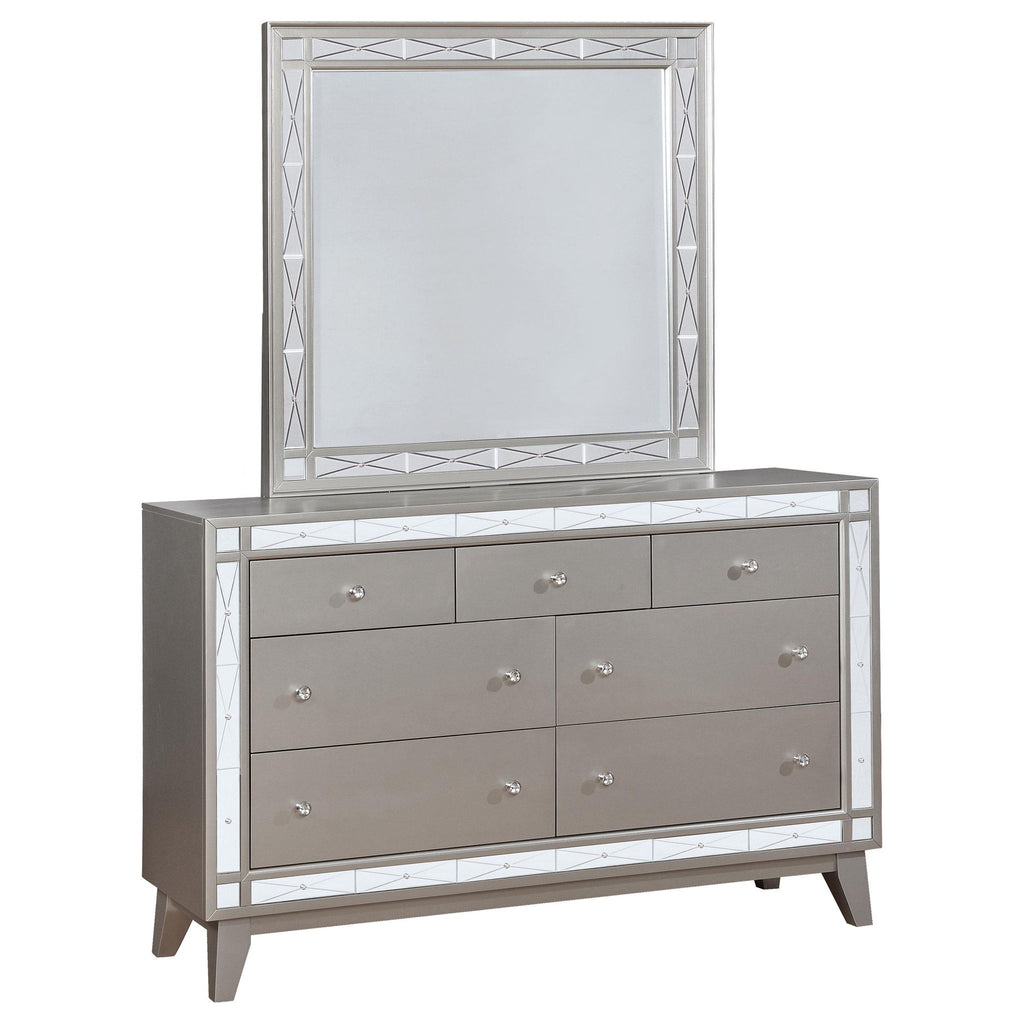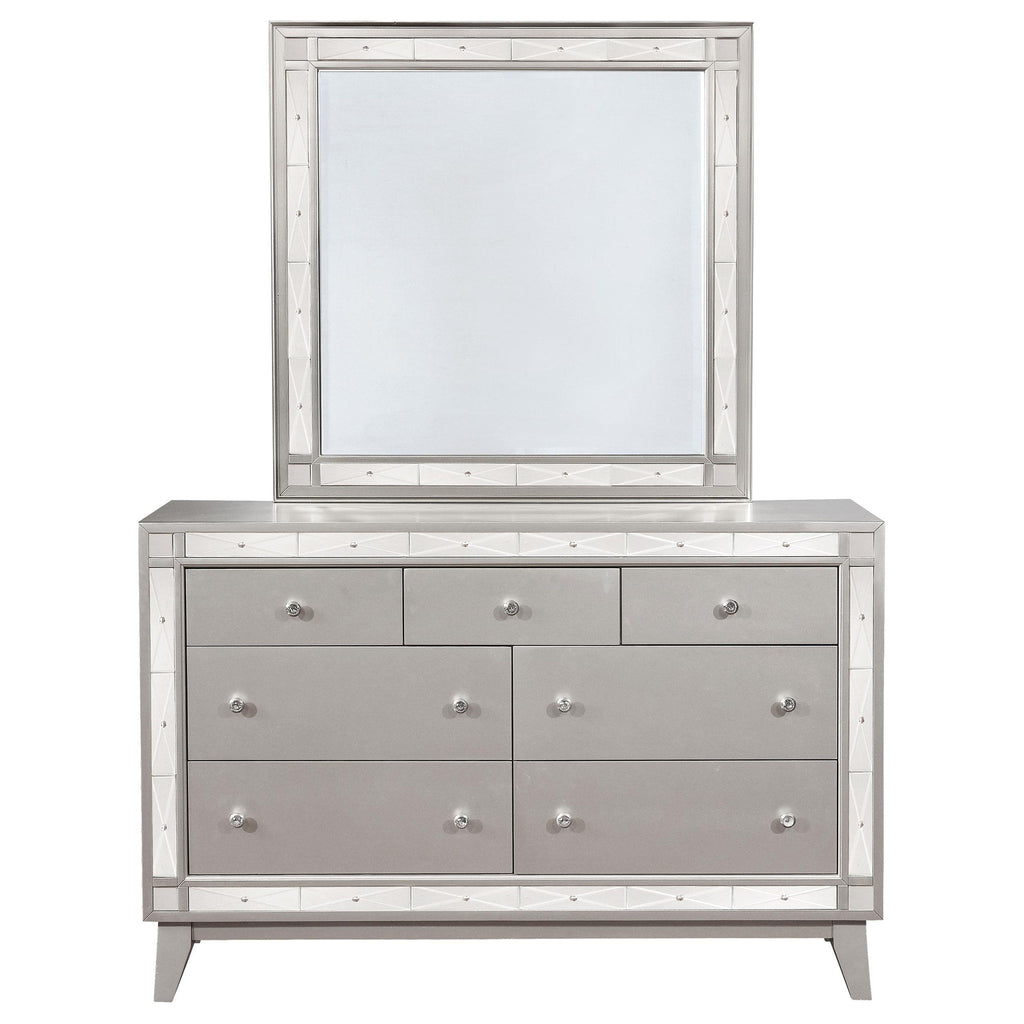 Elevate your bedroom's style with this chic and sparkly dresser and its stunning mirror. The dresser's metallic mercury finish and reflective accents provide a polished and dazzling shine. Its spacious drawers offer ample storage for clothing and accessories. The transitional mirror, with its etched mirror panels and metallic mercury finish, radiates chic light, adding a luxurious touch. Its angled corners and embossed mirrored glass create an elevated, stylish look, perfect for enhancing your dressing routine.