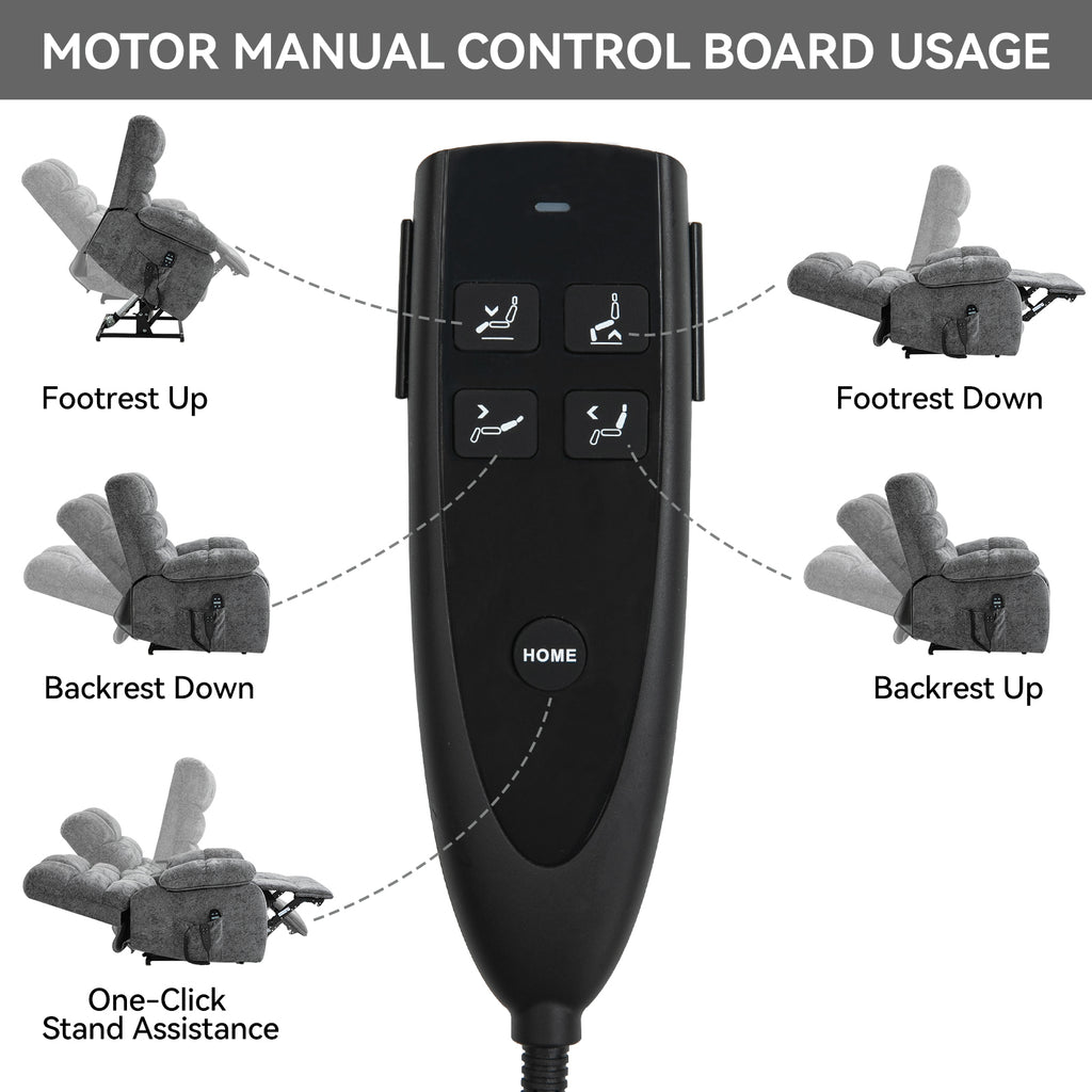 You can press the buttons of the power-remote to control the lift or recline of the recliner chair, which means you can get any position you want, it's reclining close to 180 degrees or lifting. The lift chair is powered by electric motor mechanism to push the entire chair up, working smoothly and silently to help the elderly stand up easily. It's also ideal for people who have balance problems with legs or back, or who after surgery.