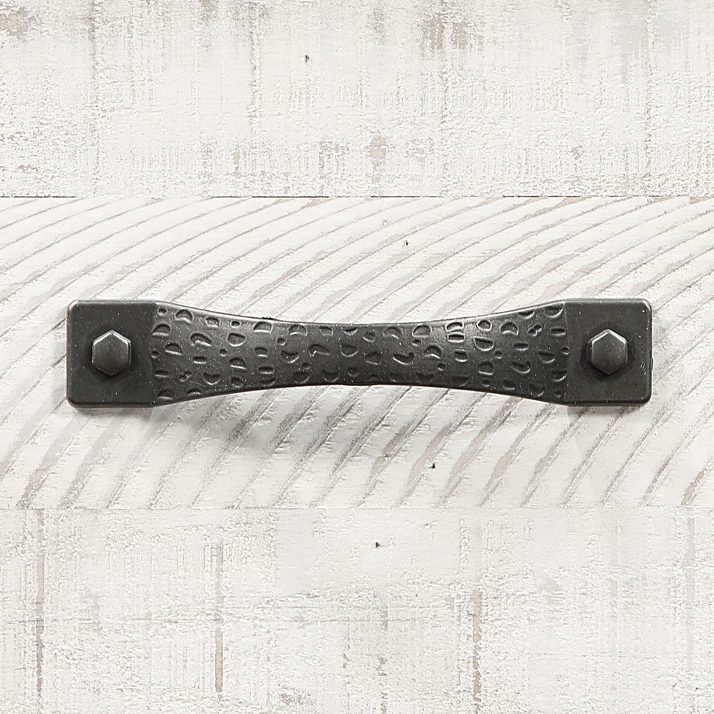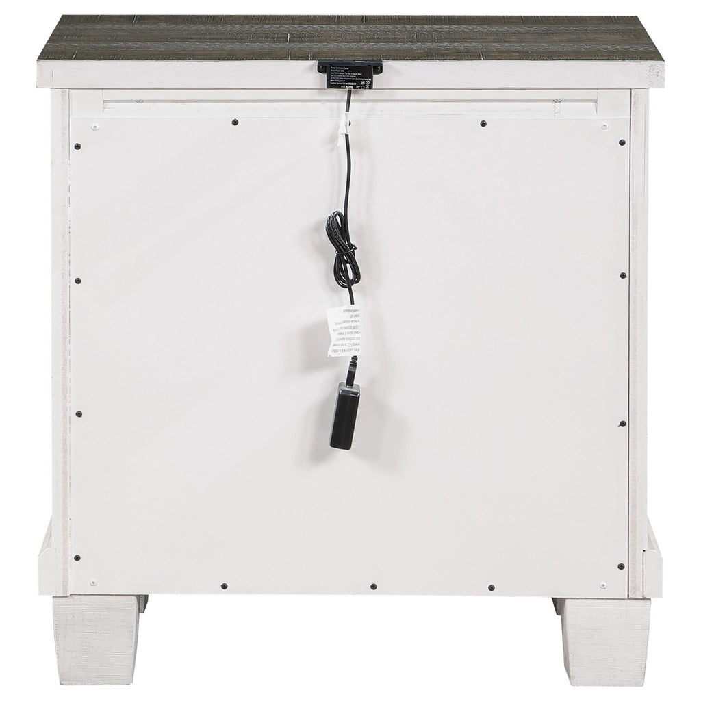 Roughhewn details bring rugged industrialism to the rustic farmhouse character of this two-drawer nightstand. Solidly built in pine wood and veneer, it features a distressed gray tabletop paired with a distressed white finish over its drawer case and base, creating dynamic contrast. The front of the case is punctuated with four hexagonal bolt heads that play into its rugged motif to perfection. Two roomy drawers includes dark gunmetal finish handles for easy access to bedside essentials and personal items. Finally, the nightstand is made modern with one standard USB port and one Type-C port that help keep all your personal electronics charged and ready for the day ahead.