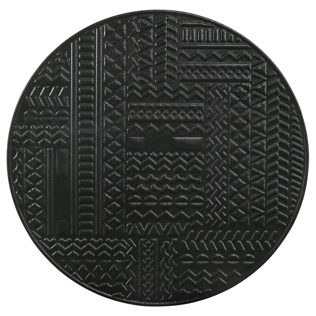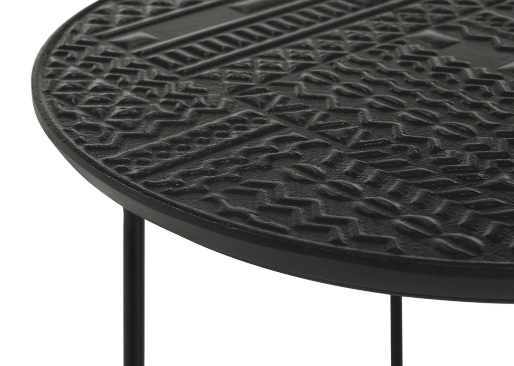 Add a modern rustic touch to your space with this two-piece nesting table set, designed for style and function. Crafted from eco-friendly solid mango wood, the embossed tribal-inspired ink blot pattern on the round tabletops adds a textured global aesthetic. Supported by slim black iron bases with a cage-like silhouette, these tables offer an airy and lightweight feel. Ideal for small spaces, the smaller table conveniently nests under the larger one, making it perfect for versatile living areas. Whether used together or separately, this contemporary set blends organic charm with industrial edge.