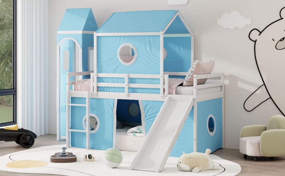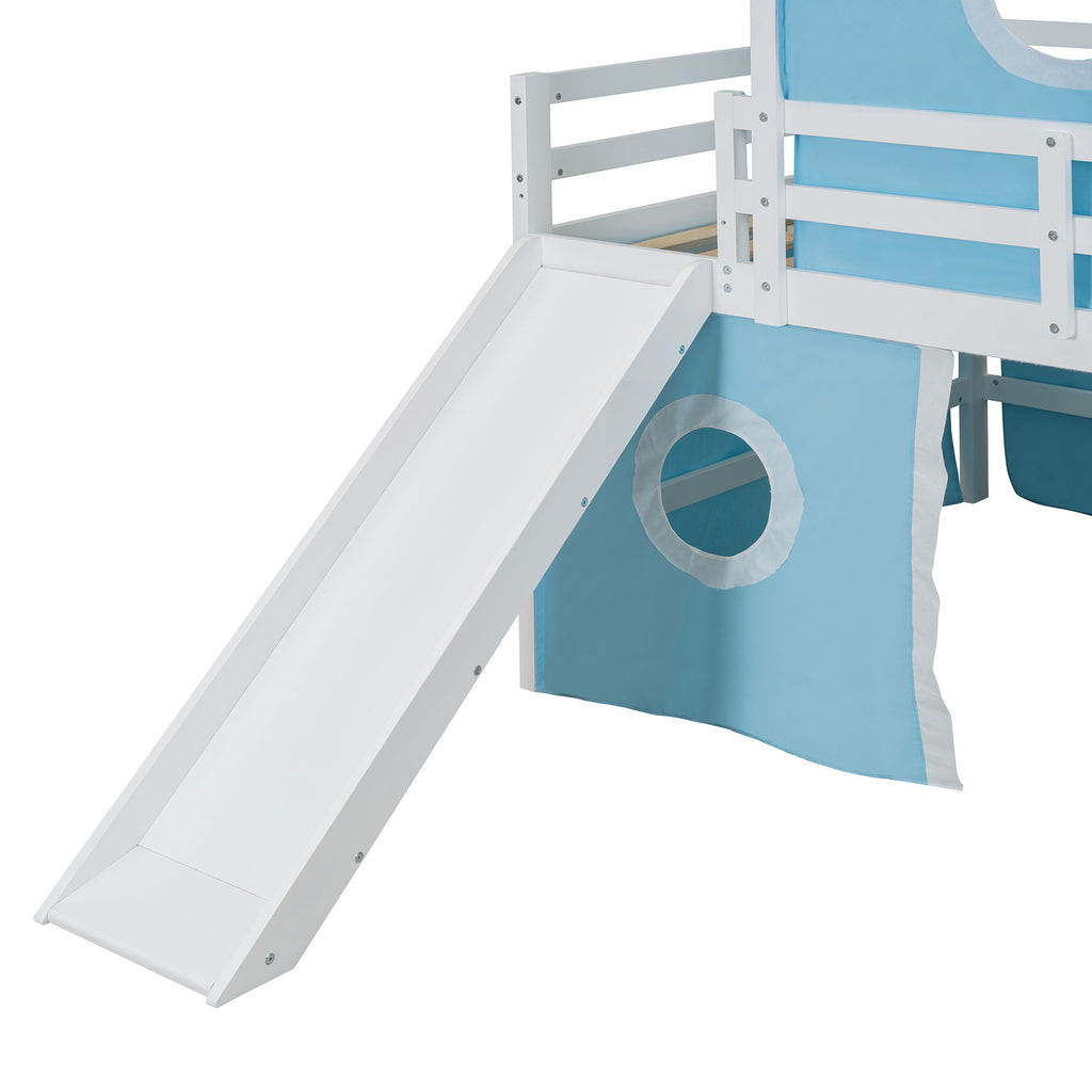 Twin Size Loft Bed With Slide Tent And Tower - Blue