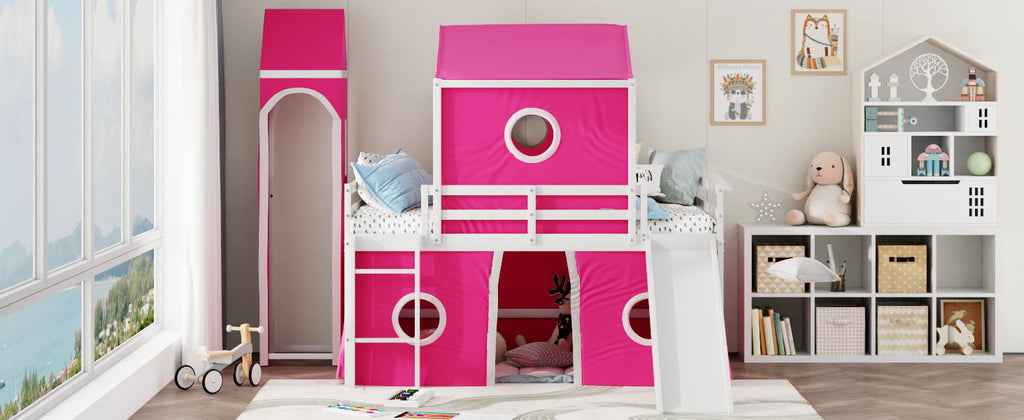 Full Size Loft Bed & Slide Tent And Tower - Pink