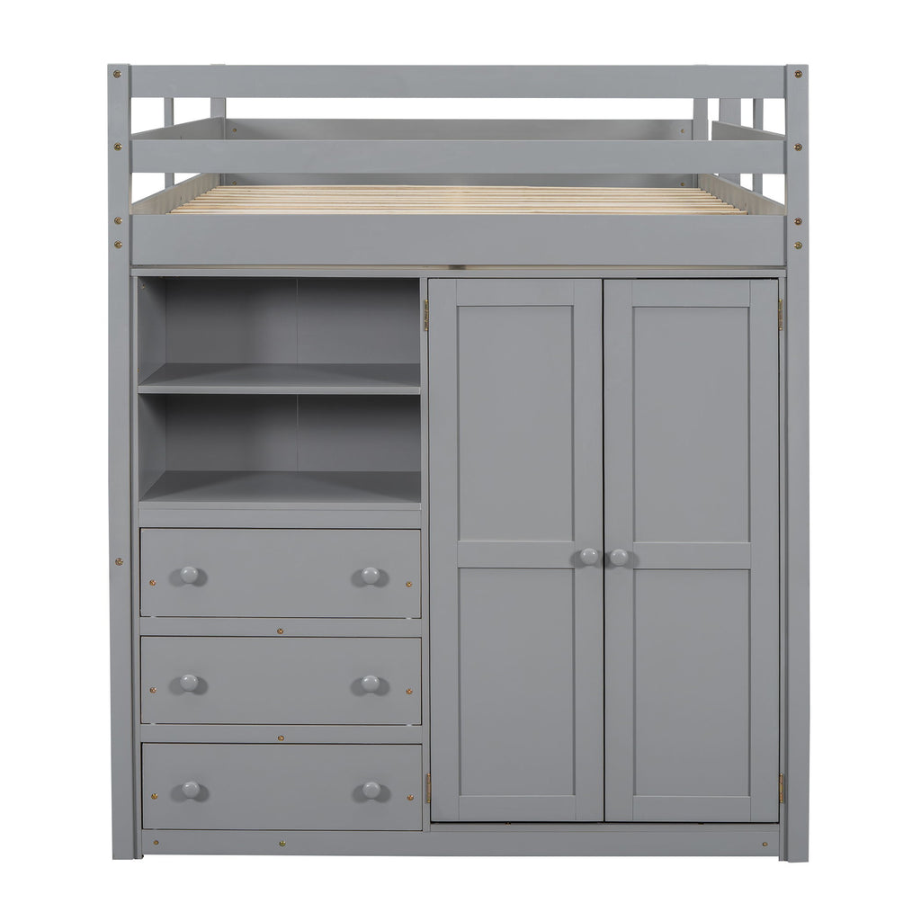Full Size Loft Bed & Built In Wardrobe, Desk, Shelves, And Drawers - Gray