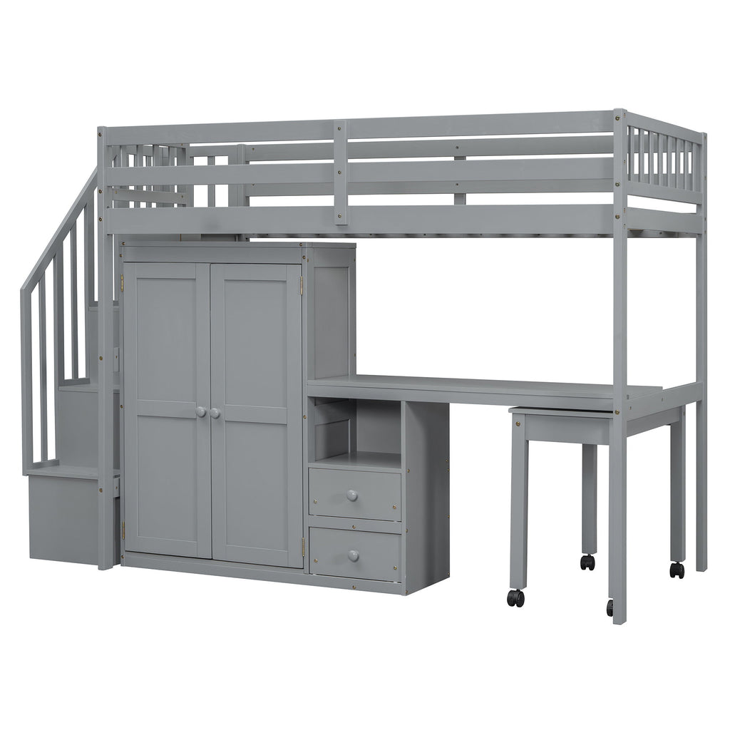Twin Size Loft Bed With Stairs, Bookshelf, Drawers, Desk & Wardrobe, Space Saving Multifunctional Furniture - Gray