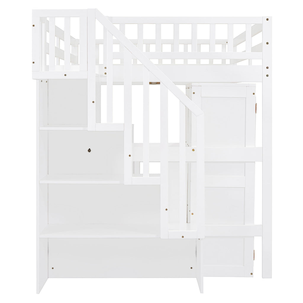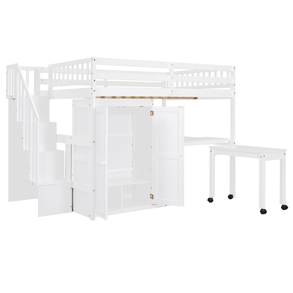 Full Size Loft Bed With Stairs, Bookshelf, Drawers, Desk & Wardrobe, Space Saving Multifunctional Furniture - White