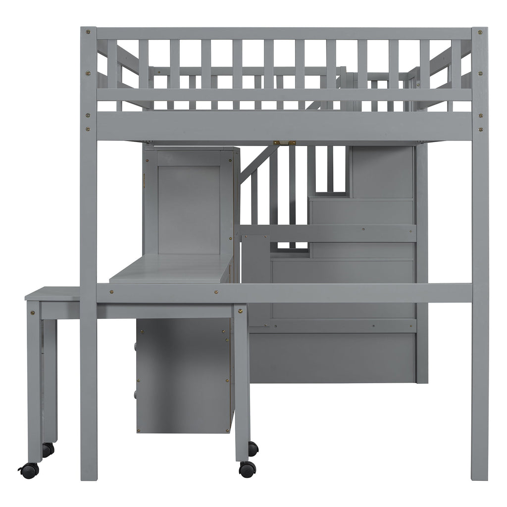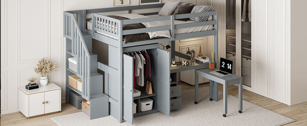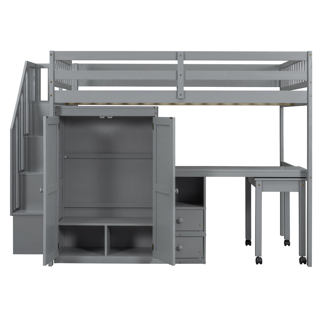 Full Size Loft Bed With Stairs, Bookshelf, Drawers, Desk & Wardrobe, Space Saving Multifunctional Furniture - Gray