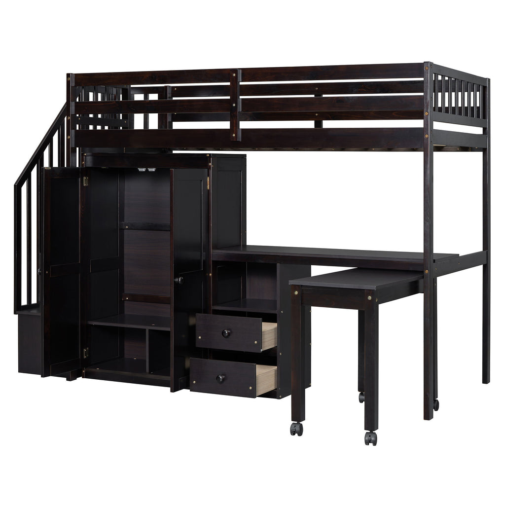 Twin Size Loft Bed With Stairs, Bookshelf, Drawers, Desk & Wardrobe, Space Saving Multifunctional Furniture - Espresso