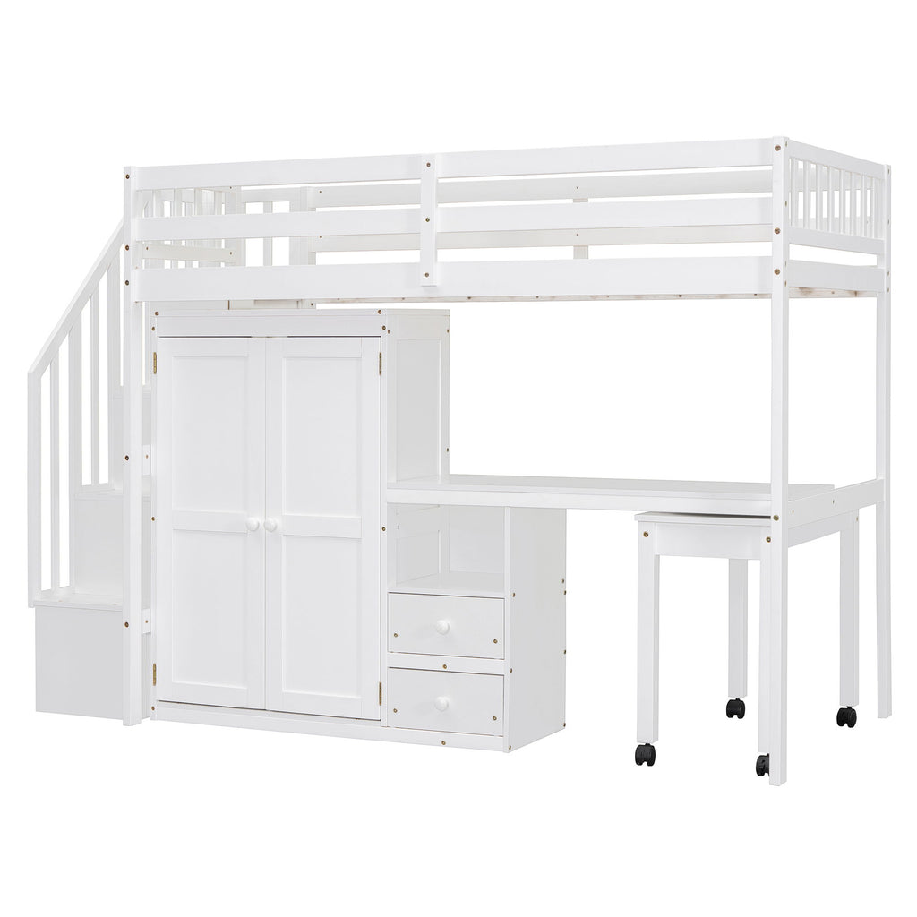 Twin Size Loft Bed With Stairs, Bookshelf, Drawers, Desk & Wardrobe, Space Saving Multifunctional Furniture - White