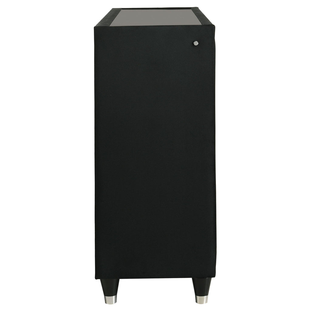 Wrapped in sumptuous black velvet, this eight-drawer dresser exudes soft luxury with functional brilliance. Reflective acrylic accents, crystal knobs, and quilted fronts enrich each drawer, while LED trim and a clear tempered glass top add a luminous, polished finish. Solid rubberwood legs elevate the profile, and black felt-lined top drawers, dovetail joinery, and metal extension glides ensure enduring performance and elegance.