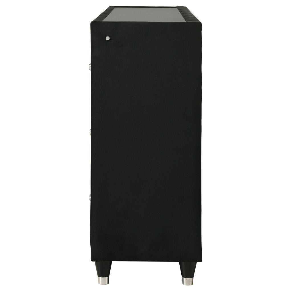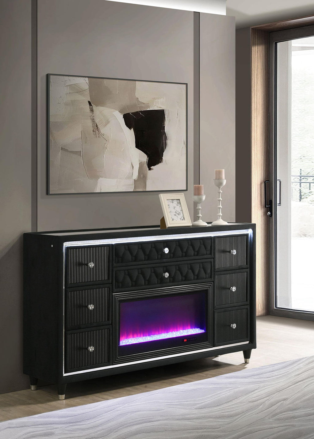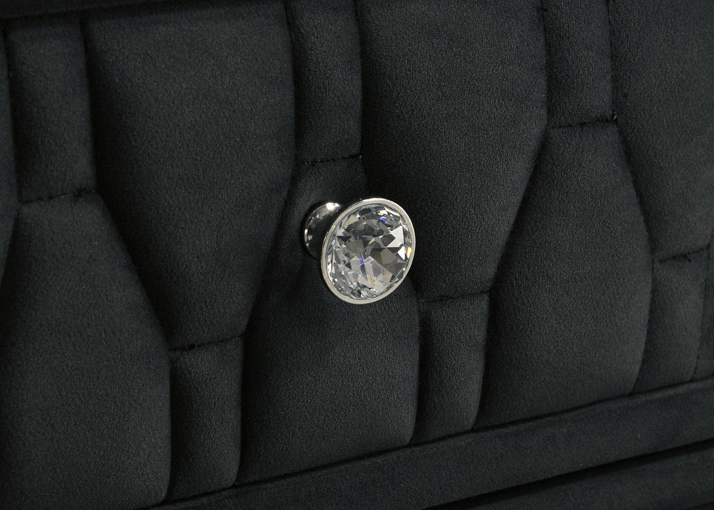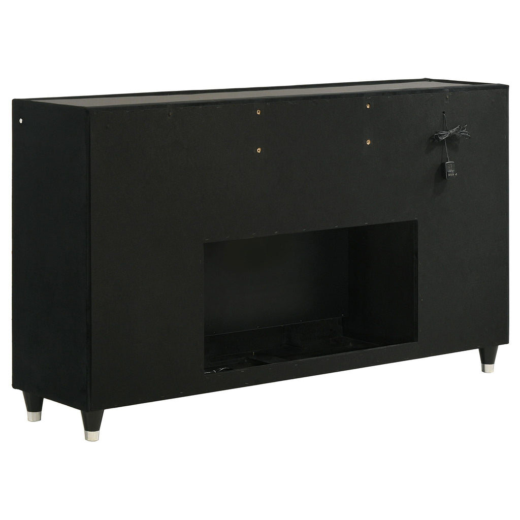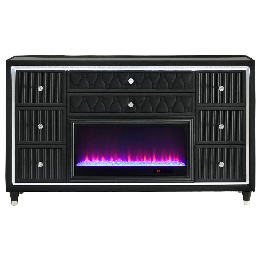 Infuse your space with cozy glamour in this eight-drawer flame box dresser, richly upholstered in black velvet. A built-in LED flame visualizer is framed by clear tempered glass and acrylic details, while crystal knobs and quilted velvet drawers shine with elegance. LED case lighting and a wireless remote enhance function, while black felt-lined top drawers, dovetail joints, and metal extension glides provide strength and finesse atop solid rubberwood legs.