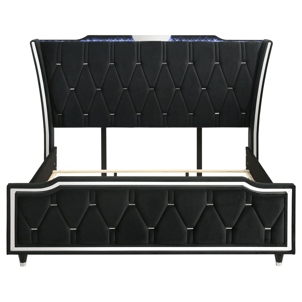 Indulge in soft glamour with this wingback bed, richly upholstered in a luxurious black velvet. A tall, button-tufted headboard curves outward with sculptural wings and a built-in LED crown accent for ambient glow. The padded footboard echoes the headboard’s tufted detail and rests on solid rubberwood legs for a touch of airy elegance. Crafted from solid and engineered wood, this foundation-ready frame is a statement in luxury and comfort.