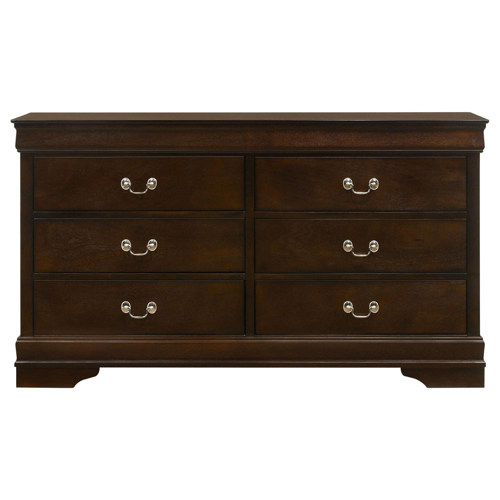 The Louis Philippe collection is highlighted by this 4-piece bedroom set that is perfect for the guest bedroom or youth bedroom. The Full bed (also available in Eastern King, Queen, and Twin) is characterized by a high headboard and low footboard, both with slightly flared styling. The nightstand and dresser have deep drawers with dovetail construction and silver bail handles for convenient pull-out and stylish appeal. Place the impressive rectangular mirror fits upon the dresser to complete the look. Built from select hardwoods and wood veneer, this traditional-style set comes with a cappuccino finish that adds a warm ambiance to the bedroom.