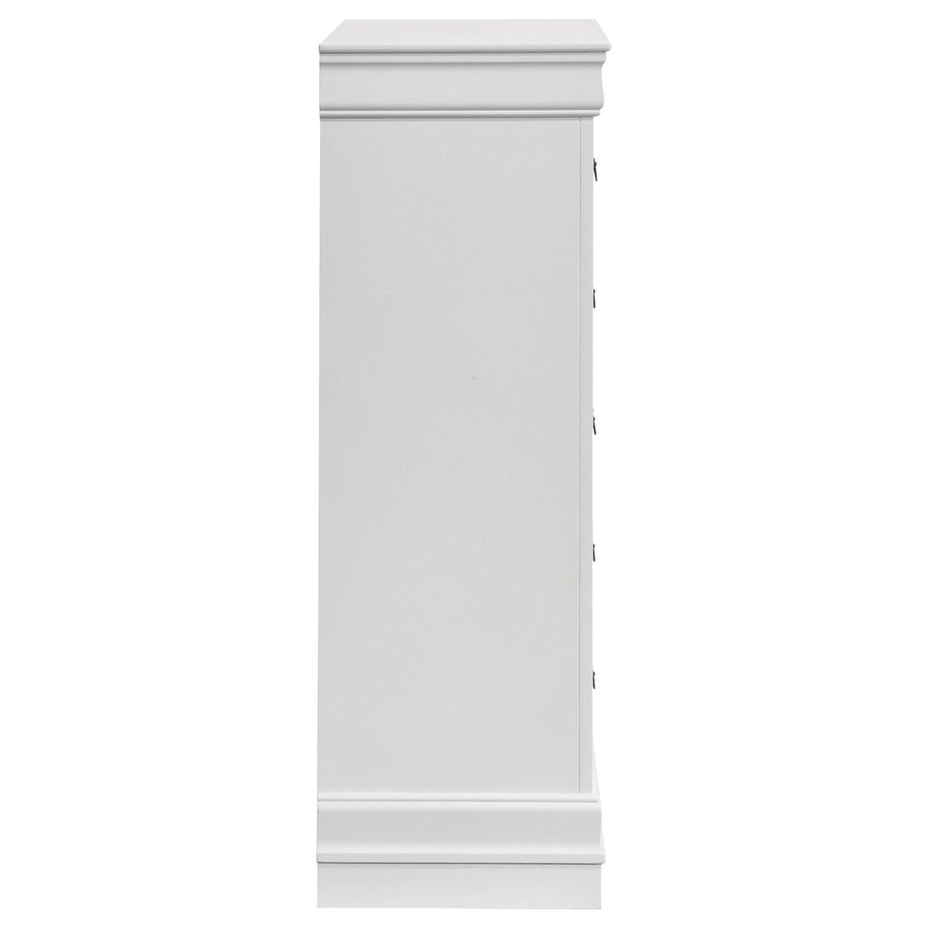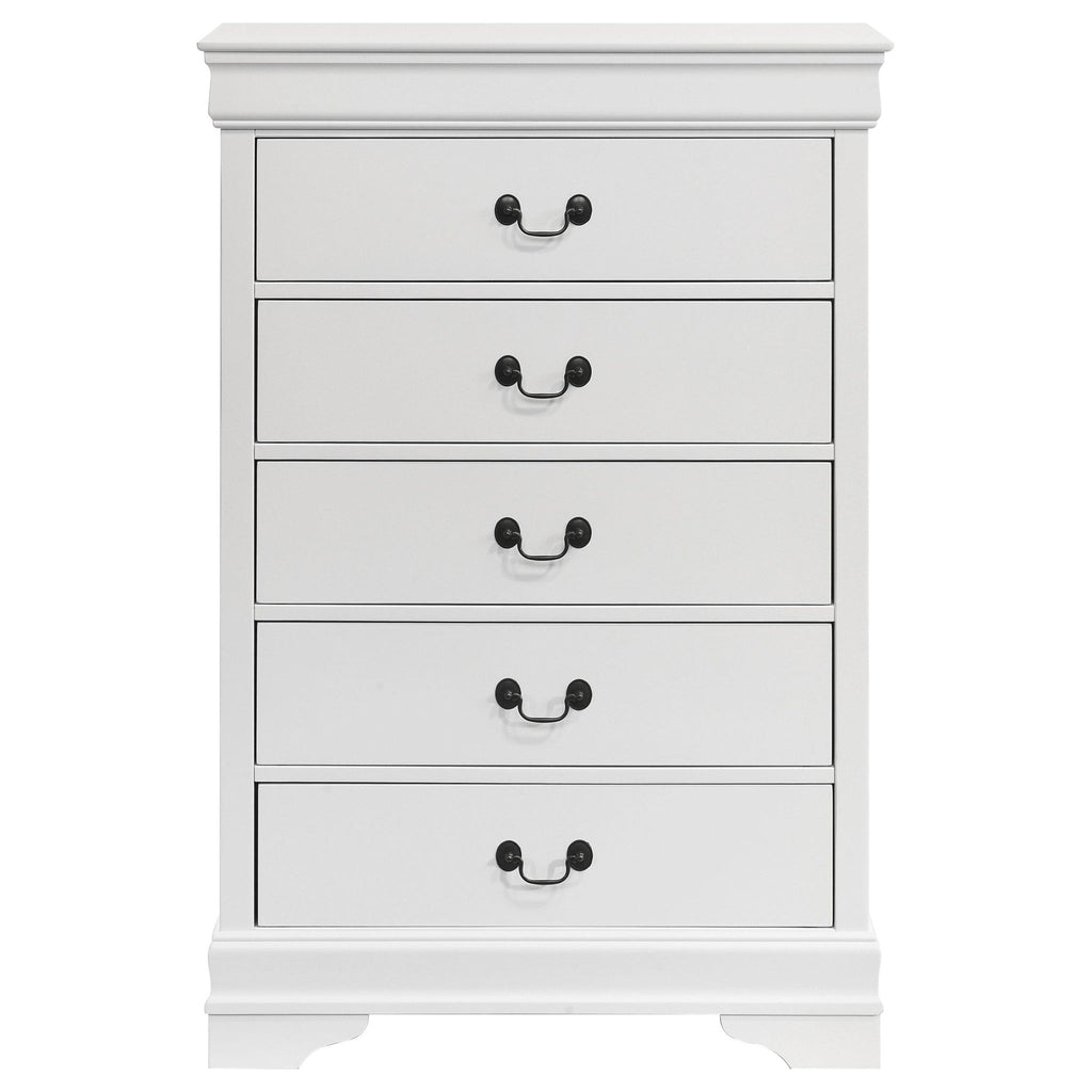 Complete your stylish bedroom with the ample storage provided by this transitional five-drawer chest. It's cool white finish blends in a variety of bedroom spaces, creating a fresh, approachable look. Each drawer features a hanging pull in a dark finish, creating a touch of character and contrast. Molded trim and bracket feet complete the look with a hint of movement. Use the top for a valet or jewelry box or choose decor that adds a personal touch.
