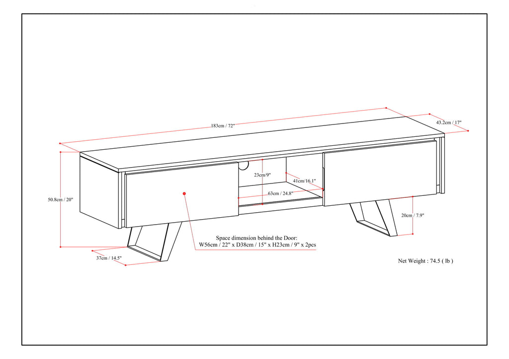 72.0"W x 17.0"D x 20.0"H - 75.0 lb