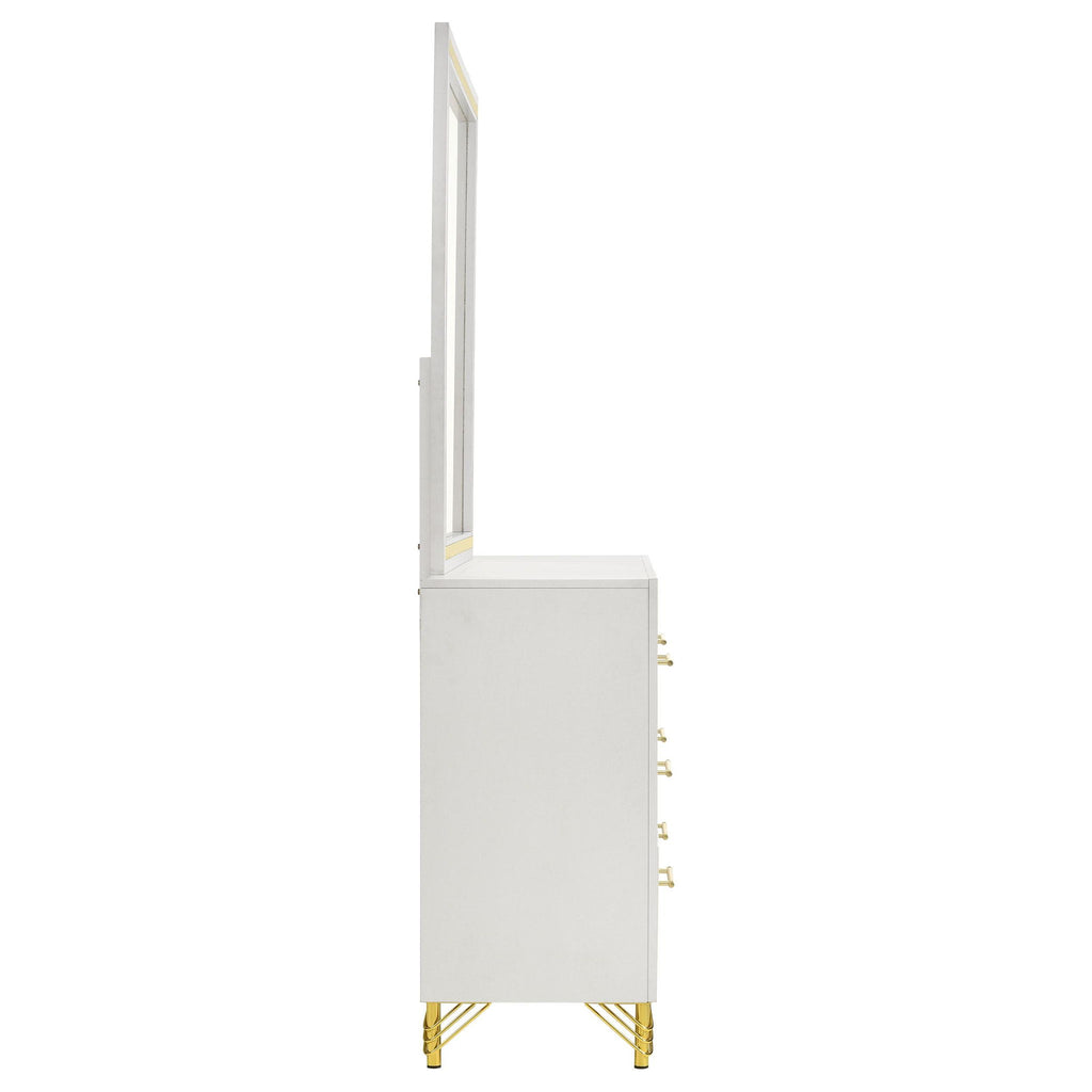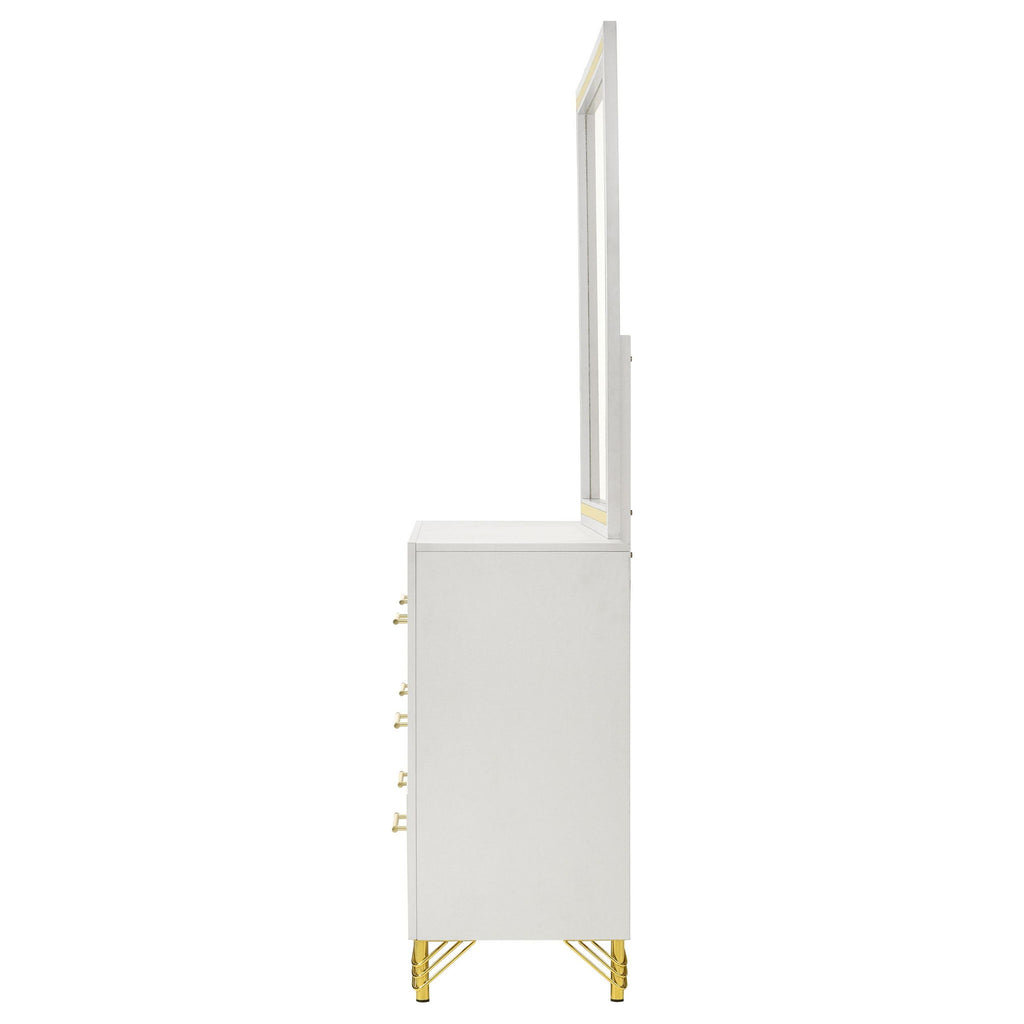 Introduce sophisticated and a hint of glamour with a modern six-drawer dresser and mirror set. Perfect for your stylish bedroom, it offers roomy drawers with smooth interiors perfect for clothing and accessories. The dresser features a clean white finish, with bands of shiny gold trim and matching hardware and legs. The mirror on top is framed to match the front of the case, creating a sense of cohesion and richness in your dressing area. Decorative legs add a glam touch while the wide top is ideal as a vanity or for decor.