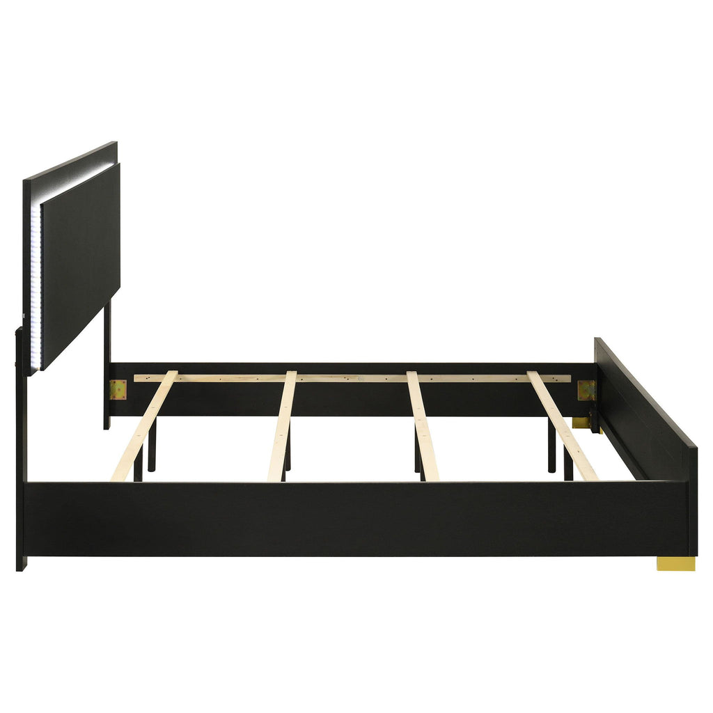 Explore the possibilities of modern features that render this chic bed a haven for relaxation and a comfy place to sleep and lounge. A stylish yet minimalist design feature is perfect for anchoring your contemporary bedroom. Assembled of wood products and melamine laminate, it offers updated and sturdy construction. Ethereal energy-efficient lighting frames its tall headboard, operated with a touch mechanism through headboard-mounted buttons. Gleaming gold metal finish feet are petite yet noticeable.