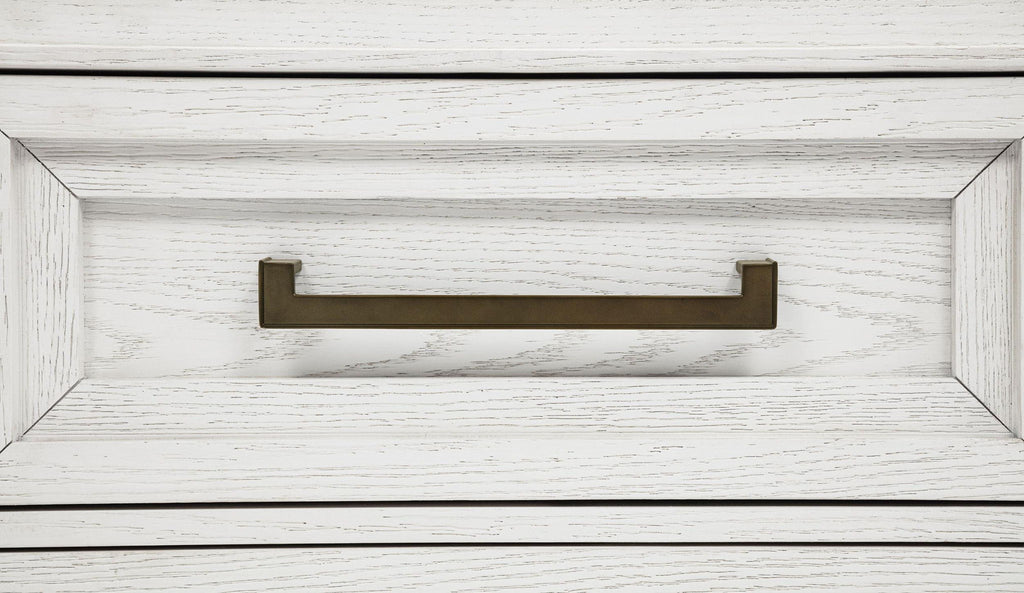 Embrace the fresh, contemporary style of a four-piece bedroom set. A distressed white finish highlights wood grain texture, while clean lines define the set with refined, inviting ambiance. The bed pairs a tall headboard and low footboard for an open profile adding to the modern appeal of this set. It includes a six-drawer dresser with a framed mirror, creating ample storage for clothing and linens. A two-drawer nightstand adds bedside storage and provides the perfect spot for a reading lamp or a vase of fresh flowers.