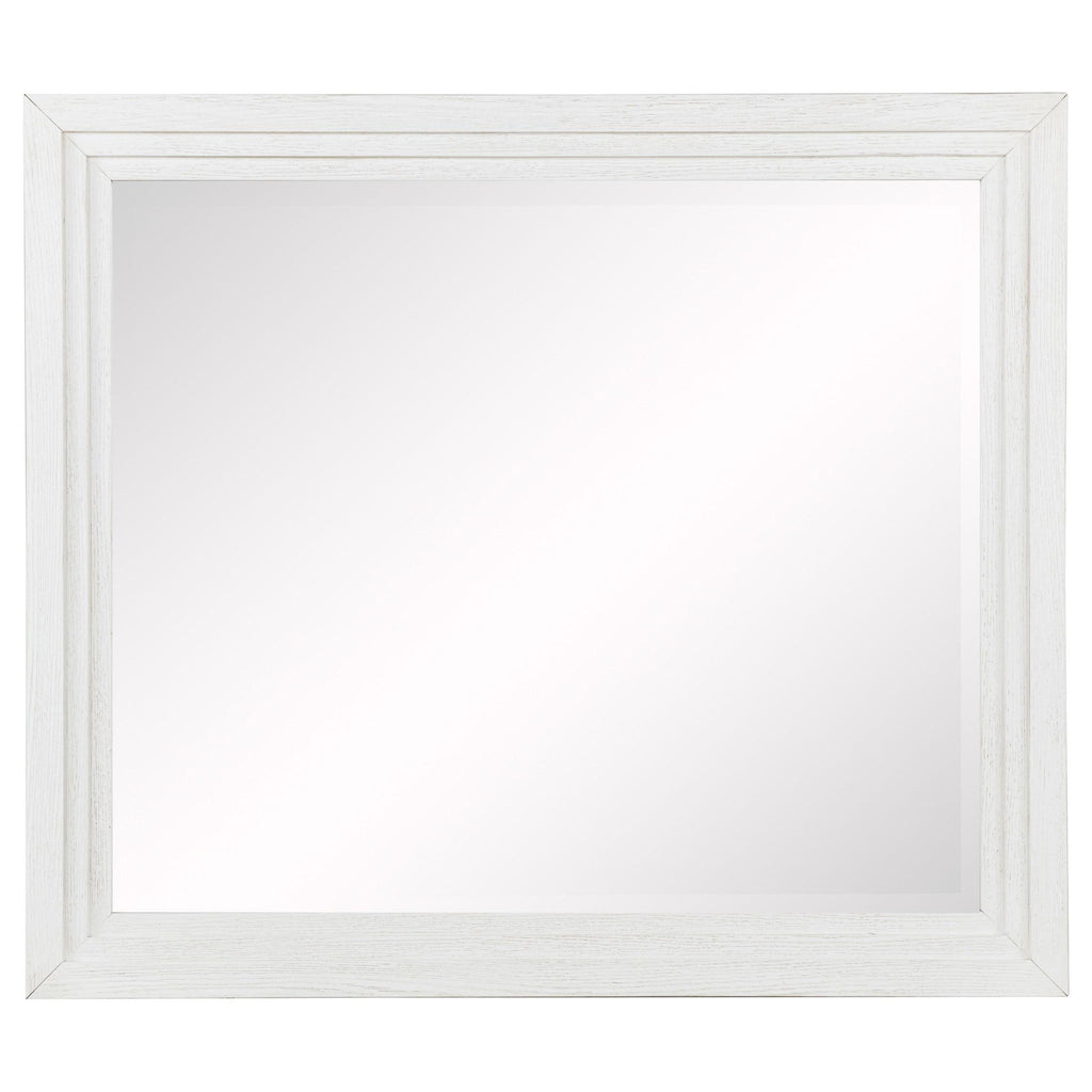 Distinctive hardware and layered trim work create a refined but dimensional effect for a five-piece modern bedroom set. In distressed white with wood grain texturing, it's a complete set that includes an upholstered bed with a padded headboard, two-drawer nightstand, five-drawer chest, and six-drawer dresser and mirror. It delivers ample storage and easy organization in a cohesive bedroom ensemble. The bed features a contemporary, open silhouette with a tall headboard and low footboard. Add colorful linens for a fresh look or stick with crisp white for a soothing monochromatic effect.