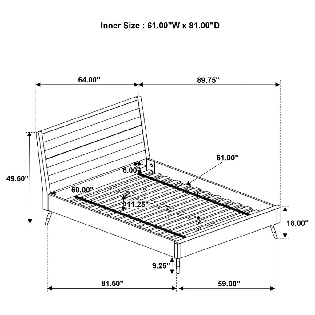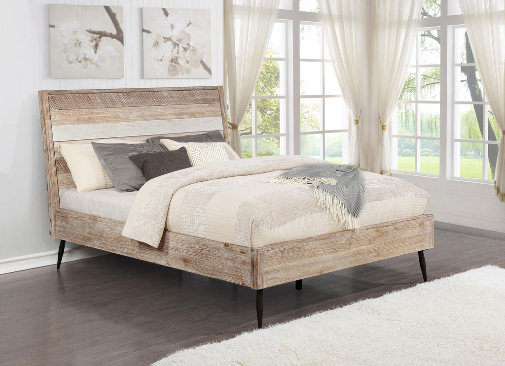 With a rustic, hand-rubbed finish in lovely, natural tones, this wooden platform bed exudes classic appeal. Flared metal legs in a matte black finish enhance its appearance with a cool, industrial edge. Crafted for quality, its durable frame is made with acacia wood, MDF, and plywood. A fully-slatted platform design offers hours of comfortable support. Combined with matching bedroom furniture, this wooden bed completes a master suite or guest room in style.