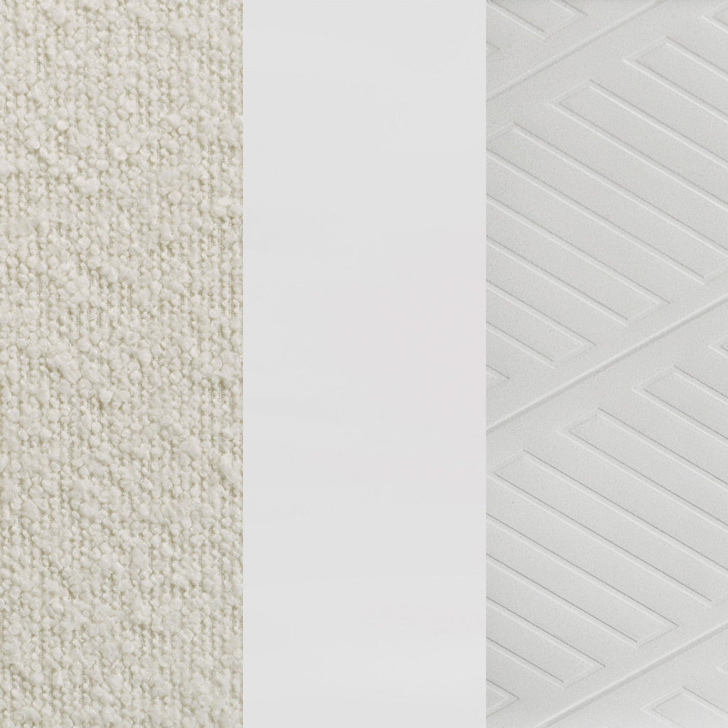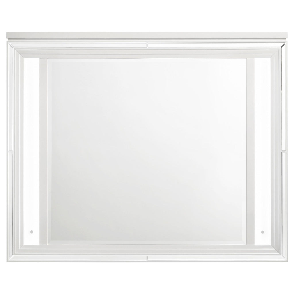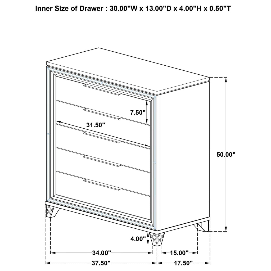 Create a cohesive and luxurious look in your bedroom with this bedroom set. Featuring a bed, nightstand, dresser, mirror, and optional chest, each piece is designed with a modern Italian aesthetic. The white finish, picture framed recessed panels, and embossed herringbone graphic patterns exude sophistication, while the mirror framing, acrylic legs, and polished chrome metal hardware add a touch of opulence. This set offers both style and functionality, making it the perfect choice for your elegant bedroom.