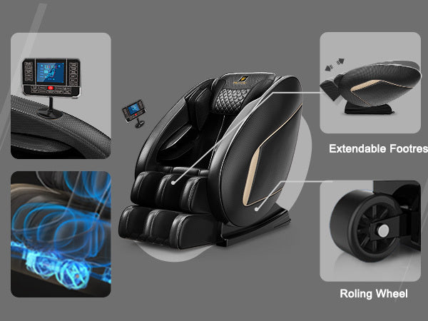 - 【Humanized& Bluetooth Design】:The massage chair has a retractable footstool and a rolling wheel at the bottom of the chair, so you can easily move it around the room. Bluetooth audio connection function, you can enjoy music while massage.