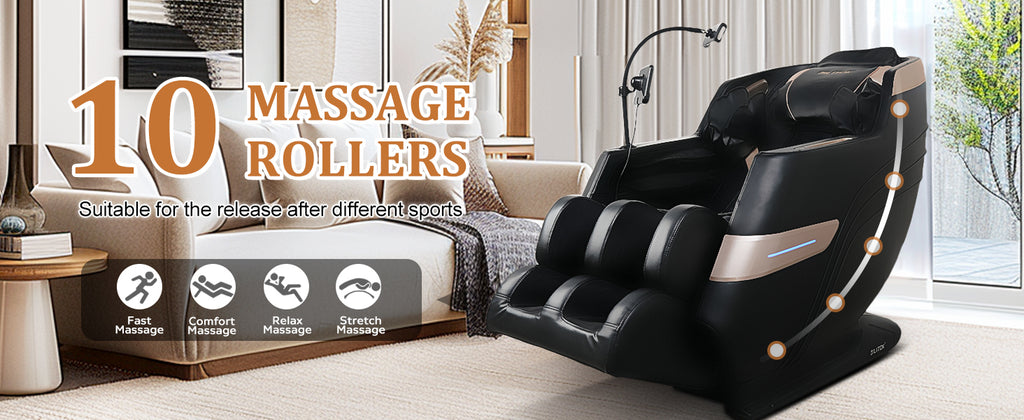 - [Full-body massage] The massage chair has 10 fixed rollers on the backrest to provide targeted massage therapy for your neck, back and lumbar area. You can choose from 5 preset automatic modes to customize your massage experience. It is also equipped with heating for the lumbar and leg areas to improve blood circulation and relieve sore muscles. The chair includes multiple airbags that provide adjustable pressure massage at three intensity levels for your shoulders, arms and calves.