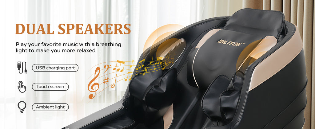 - [Humanized design] Designed with user convenience in mind, the massage chair features wheels at its base for easy mobility around the room. Integrated Bluetooth audio lets you pair your device to enjoy music seamlessly during your massage. Soft blue ambient lights along the sides create a tranquil and relaxing environment. Suitable for users weighing up to 180 pounds and standing up to 6.1 feet tall.