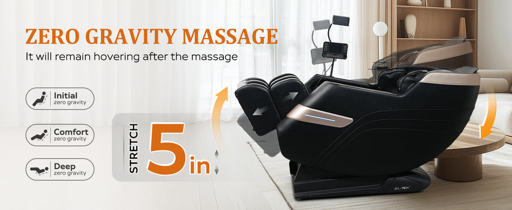 - [Zero Gravity mode]Press the 'zero gravity' button to fully recline with your feet above your heart, easing cardiovascular strain and improving circulation. The armrests and seat tilt together, letting you enjoy continuous hand massages. Post-massage, the chair stays in zero gravity mode for an extended relaxation experience.