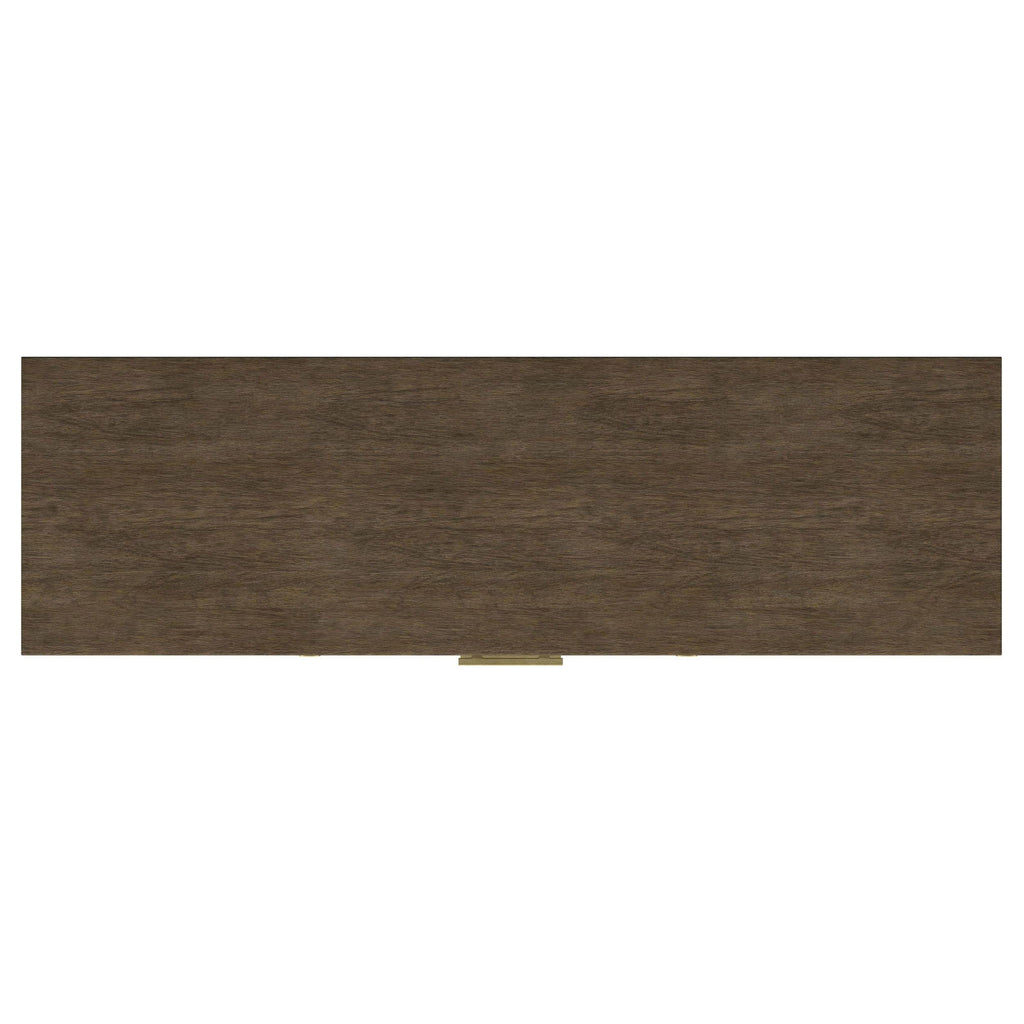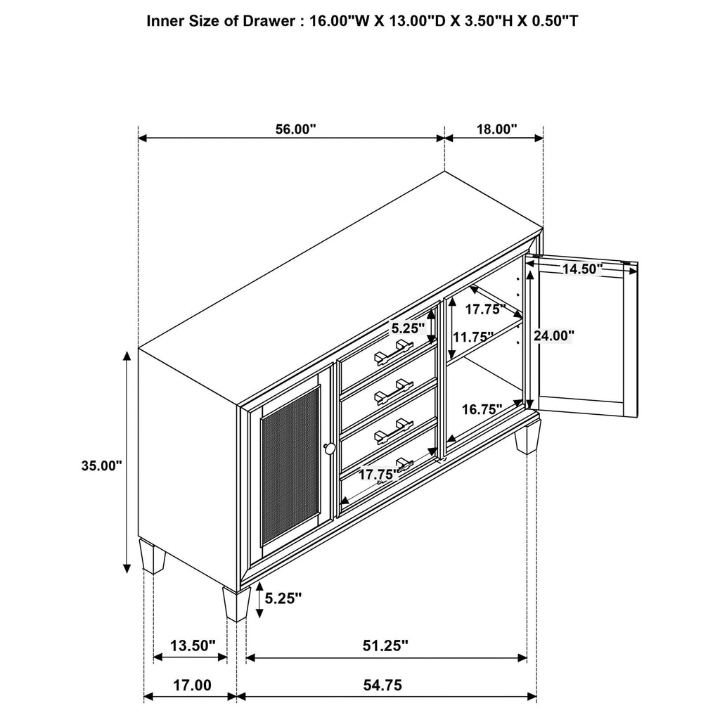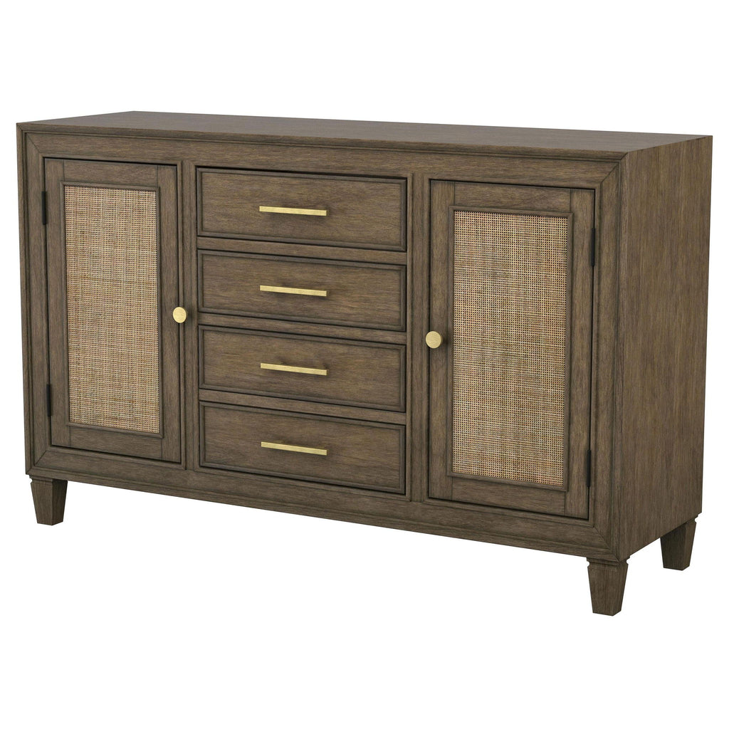 An impressive amount of storage pairs with impeccable style in a modern farmhouse sideboard. Simply charming in your dining room, it boasts a center core of four drawers, with two side cabinets that add a spot for larger items and serve ware. The sideboard is styled in a natural wood finish that's warm and inviting while each door features a lighter rattan panel, delivering airy ambiance and breezy character. Bar pulls in a warm metallic hue highlight the drawers, while doors feature matching round knobs. Serve delicious buffets on the tabletop, or choose an assortment of decor that adds a personalized touch.