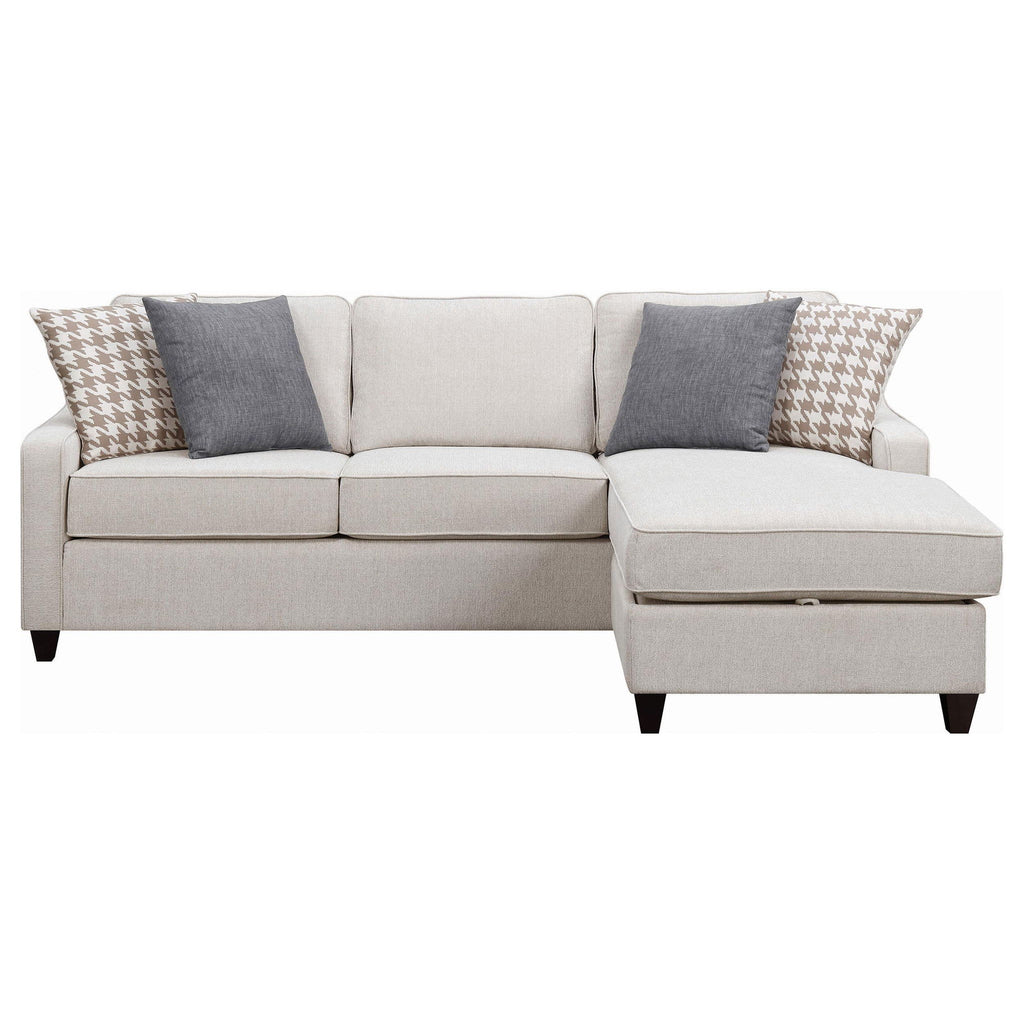 Ready to provide a sensible and stylish bonus to a transitional space, this sectional is a solid choice for a redesign. Perk up a living room or entertainment space with a comfortable and tasteful design. Configured for maximum flexibility, it accommodates sitting, lounging, and sleeping. An end lounge section adds a tasteful angled effect without taking up excessive space. With a gorgeous platinum upholstery and contrasting deep finish, tapered feet, it's a wonderfully versatile selection.